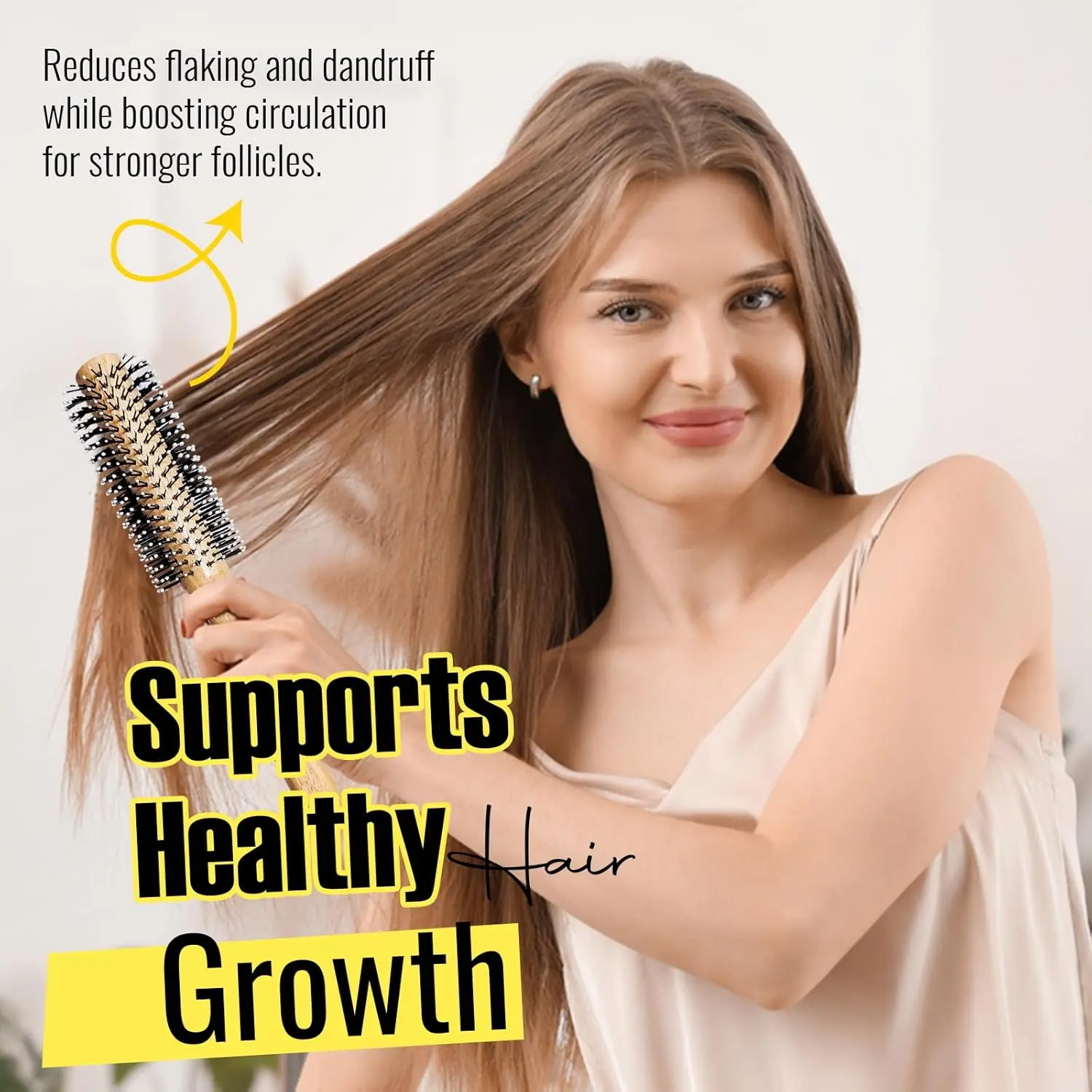 Achieve salon-quality hair styling at home with our versatile Round Brush! This innovative brush is designed to detangle, smooth, and volumize your hair, leaving you with a polished and professional look every time. Its unique bristle design, featuring a thoughtful combination of nylon and boar bristles, gently yet effectively glides through your strands, minimizing breakage and maximizing shine. The boar bristles work to distribute your hair’s natural oils from root to tip, nourishing and conditioning each strand for a healthy, lustrous appearance. Say goodbye to dull, lifeless hair and hello to radiant, revitalized locks!