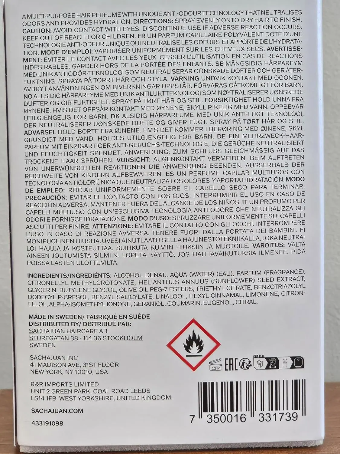 Indulge your hair with the luxurious SACHAJUAN Hair Perfume, a multi-tasking elixir designed to refresh, protect, and enhance your hair’s natural beauty. This isn’t just a fragrance; it’s a complete hair treatment disguised as a perfume. Infused with the signature fine fragrance from the renowned SACHAJUAN haircare range, it leaves your hair smelling divine while delivering essential moisture for a healthy, radiant shine. The unique anti-odour technology neutralizes unwanted scents, ensuring your hair stays fresh and clean throughout the day, no matter what challenges it faces. Beyond fragrance and odour control, this hair perfume also acts as a protective shield against environmental aggressors that can fade colour and damage strands. Its lightweight formula won’t weigh your hair down, making it perfect for all hair types. Experience the ultimate in hair care and fragrance with SACHAJUAN Hair Perfume – your secret weapon for beautiful, healthy, and wonderfully scented hair.This exceptional product goes beyond mere scent enhancement, actively working to improve the overall health and appearance of your hair. The moisturizing properties combat dryness and frizz, leaving your hair feeling soft, smooth, and manageable. The added shine enhances your hair’s natural luster, making it look vibrant and healthy. The colour protection helps to extend the life of your hair colour, preventing fading and maintaining its vibrancy. With its unique blend of benefits, SACHAJUAN Hair Perfume is the perfect addition to your daily hair care routine.