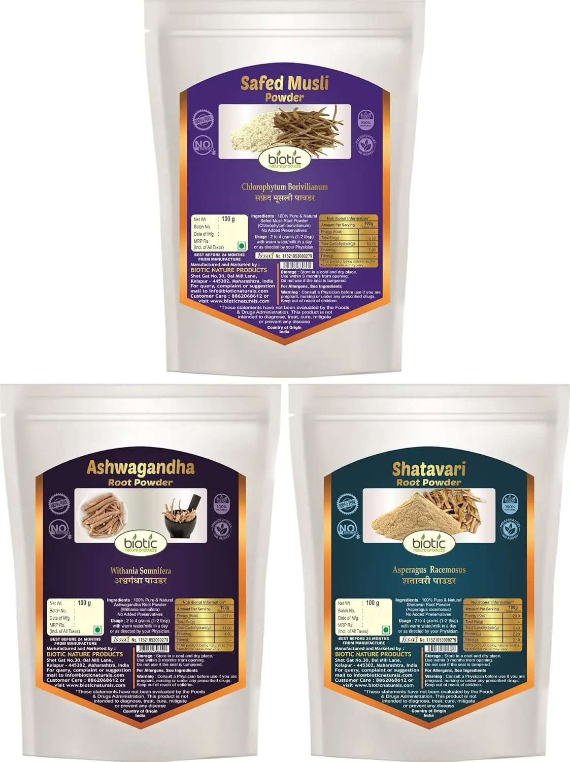 Elevate your wellness routine with our Safed Musli Ashwagandha Shatavari Powder. This potent blend combines three powerful Ayurvedic herbs known for their adaptogenic and rejuvenating properties. Safed Musli, traditionally used as a vitality booster, works synergistically with Ashwagandha, a renowned adaptogen that helps the body manage stress and improve overall well-being. Shatavari, revered for its benefits for women’s health, adds another layer of support. This 300gm powder offers a natural way to enhance energy levels, support hormonal balance, improve stamina, and promote overall health. Incorporate this versatile powder into your daily routine by mixing it with water, milk, or your favorite smoothie for a convenient and effective way to experience the benefits of these ancient herbs. Discover the holistic power of Safed Musli, Ashwagandha, and Shatavari combined in one convenient powder.