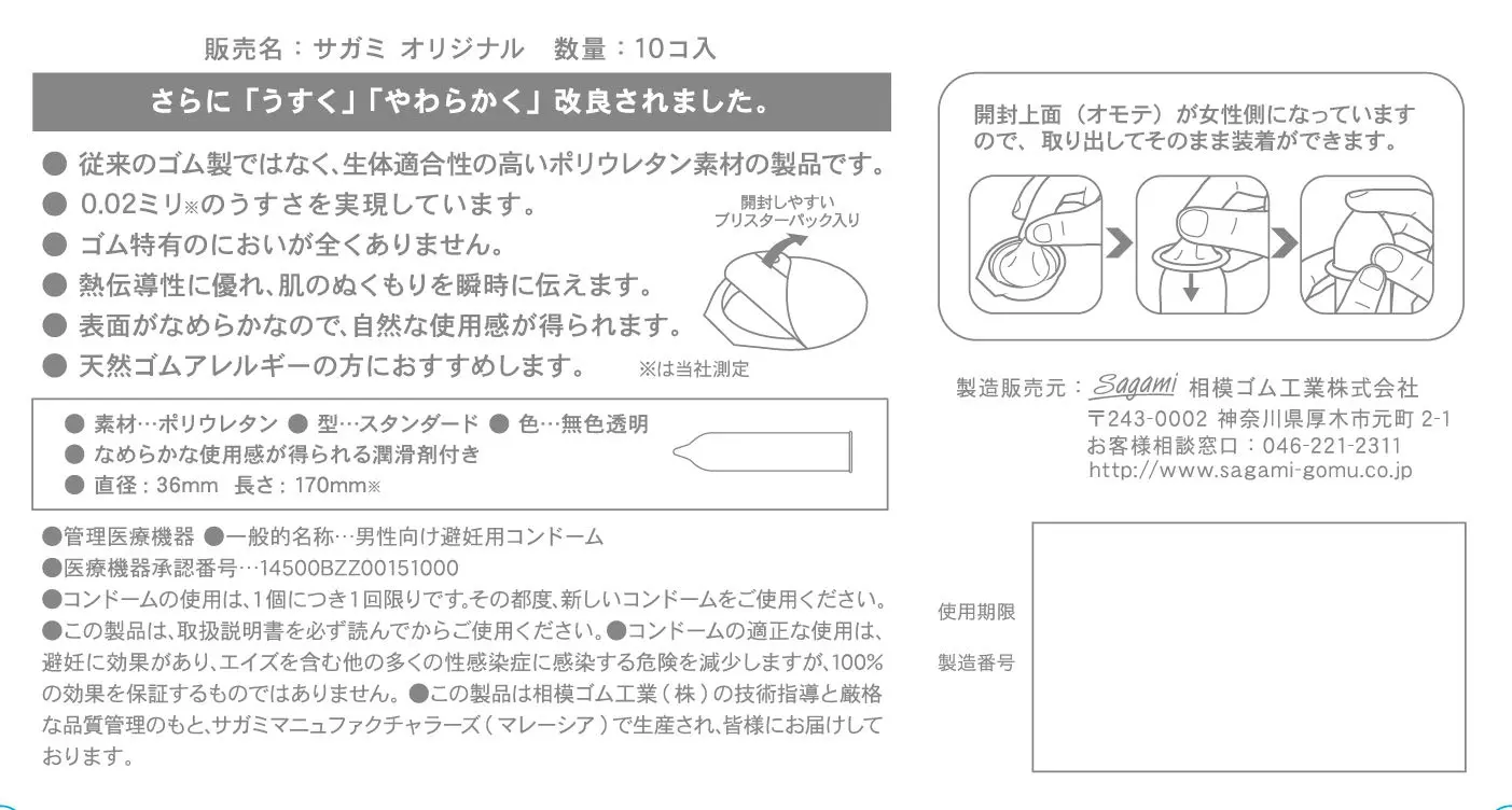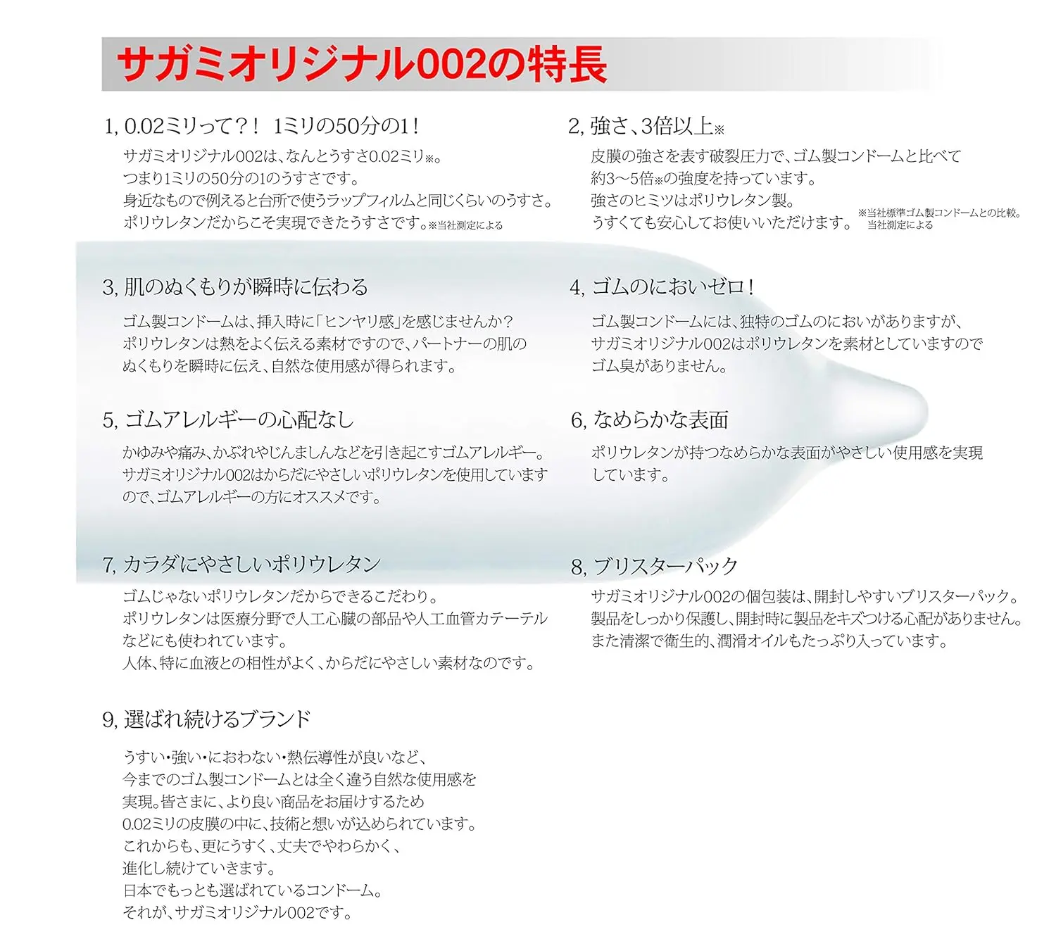Experience ultimate sensitivity and protection with Sagami 0.02 Condoms. These ultra-thin condoms are designed to provide a natural, almost imperceptible feel, maximizing pleasure for both partners. Crafted with meticulous care and utilizing advanced manufacturing techniques, Sagami 0.02 condoms offer exceptional strength and reliability. Each condom is electronically tested to ensure the highest standards of quality and safety. The hygienic packaging guarantees that each condom is in pristine condition, ready for use. Sagami condoms are renowned for their superior quality and dedication to providing a safe and pleasurable intimate experience. Enjoy the peace of mind that comes with using a trusted brand. Sagami 0.02 condoms are the perfect choice for those who demand the best in comfort, sensitivity, and protection. Sagami condoms are carefully formulated to exceed safety standards.