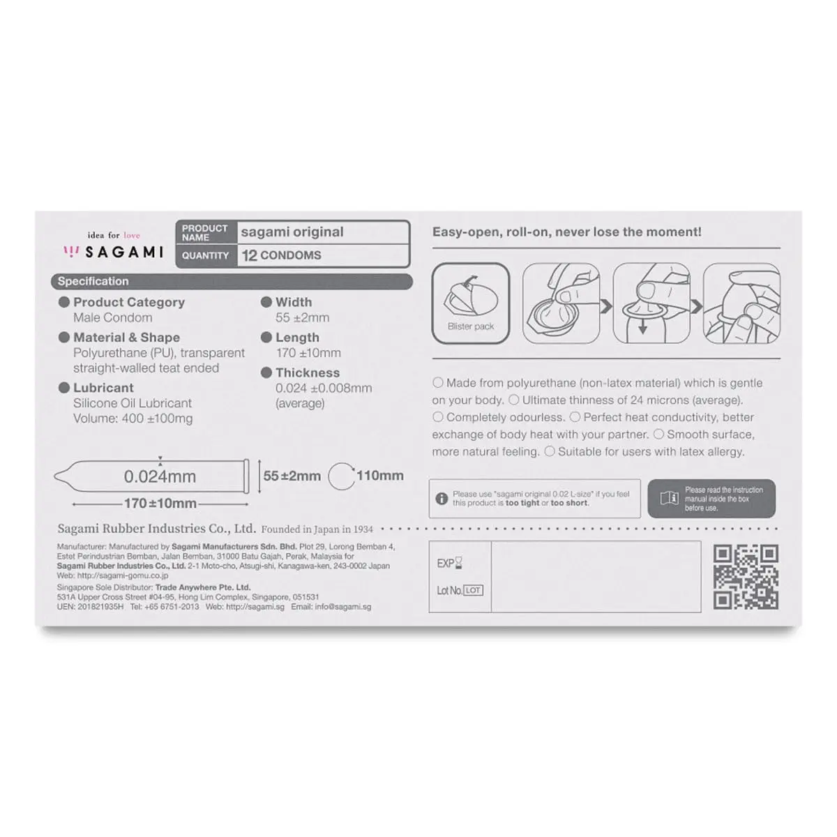 Experience the pinnacle of intimacy with Sagami Original 002 Condoms. Crafted from revolutionary urethane, these ultra-thin condoms redefine sensitivity and pleasure. Unlike traditional latex condoms, Sagami Original 002 offers approximately three times the toughness, providing exceptional reliability without compromising sensation. The unique urethane material effortlessly transmits body heat, enhancing the natural feeling of closeness and creating a more intense and passionate connection with your partner. Made from a new PU material, Sagami Original 002 condoms are hypoallergenic and odorless, making them suitable for individuals with latex sensitivities and ensuring a comfortable experience for both partners. The water-based lubricant provides optimal slippage, maximizing comfort and pleasure. Sagami Original 002 is meticulously engineered to deliver an unparalleled level of intimacy, allowing you to fully immerse yourself in the moment without any distractions. With a max width (semi circumference) of 56.5mm, max diameter of 36mm, and max length of 170mm, these condoms offer a secure and comfortable fit for a wide range of sizes. Choose Sagami Original 002 and discover a new dimension of pleasure and connection.