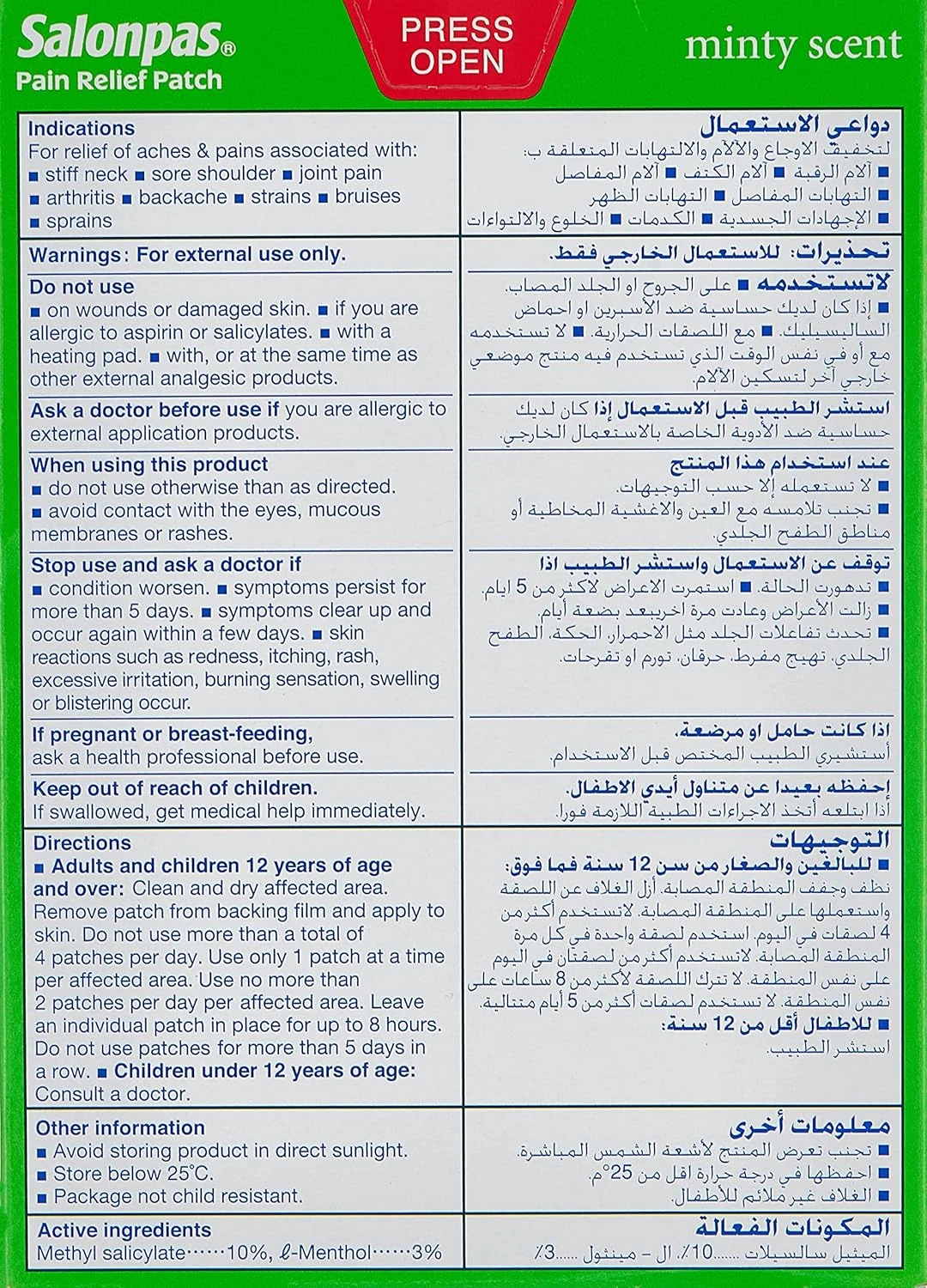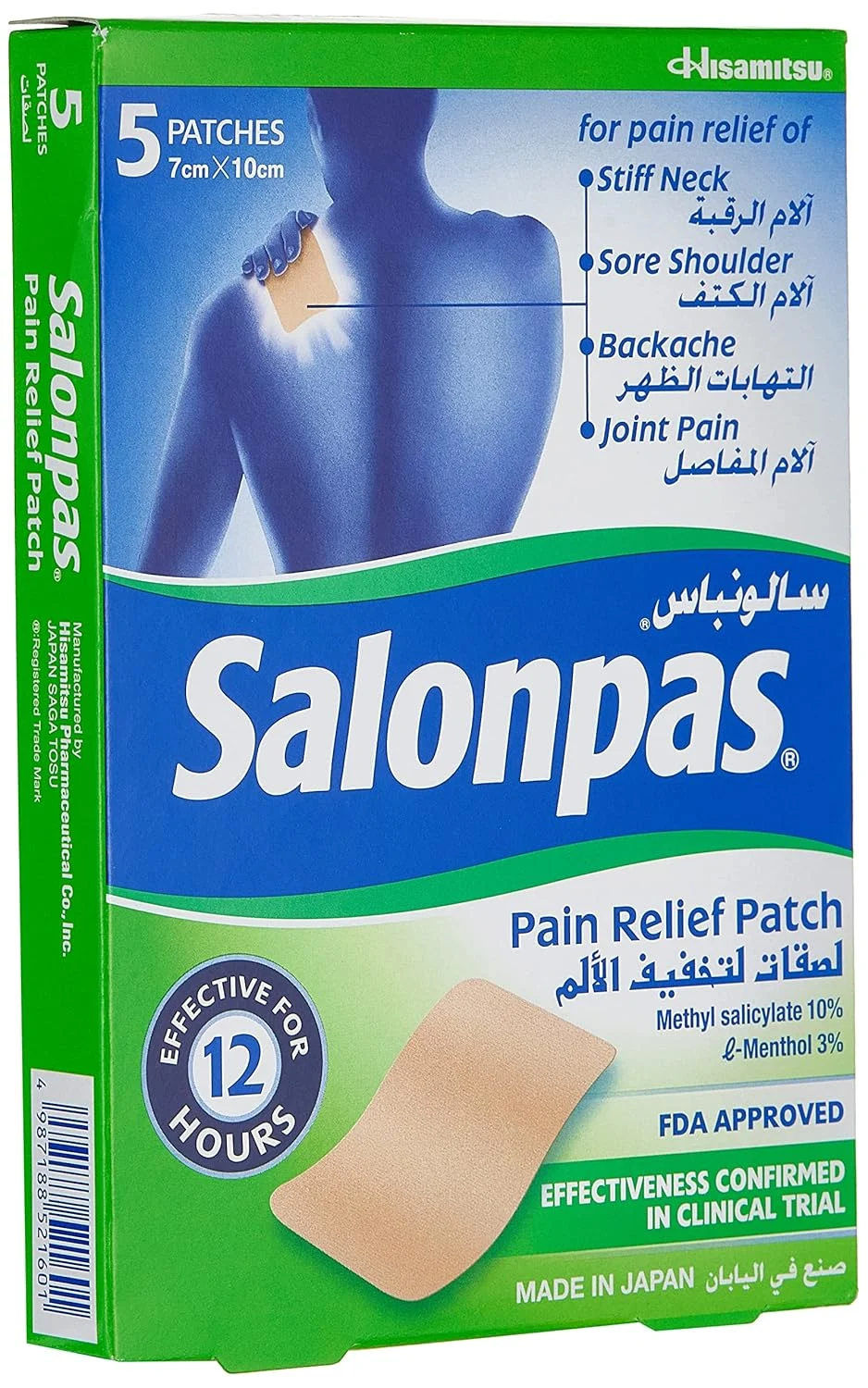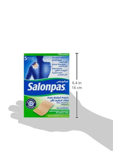 Experience long-lasting and powerful pain relief with Salonpas Pain Relief Patches. These ultra-thin patches provide up to 12 hours of targeted relief for muscle aches, joint pain, back pain, and strains. Salonpas utilizes advanced pain-relieving technology to deliver effective medication directly to the source of your discomfort. The discreet and comfortable design allows you to wear them under clothing without any bulkiness. Whether you’re dealing with everyday aches or chronic pain, Salonpas Pain Relief Patches offer a convenient and reliable solution. The easy-to-apply patches adhere securely to the skin, providing continuous relief throughout the day or night. Salonpas is a trusted brand in pain relief, known for its quality and effectiveness. Get back to doing what you love with Salonpas Pain Relief Patches. Each package contains 5 individually wrapped patches for on-the-go relief whenever you need it. Say goodbye to pain and hello to a more comfortable you with Salonpas. Don’t let pain hold you back. Choose Salonpas for powerful, fast-acting, and long-lasting relief. Suitable for adults and children 12 years and over. Read and follow all label instructions before use.