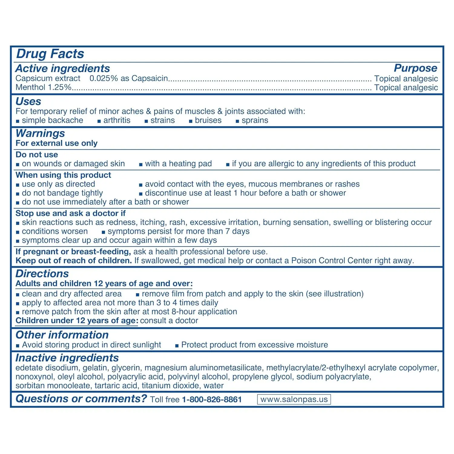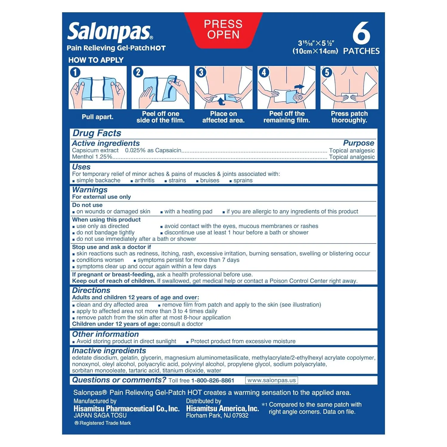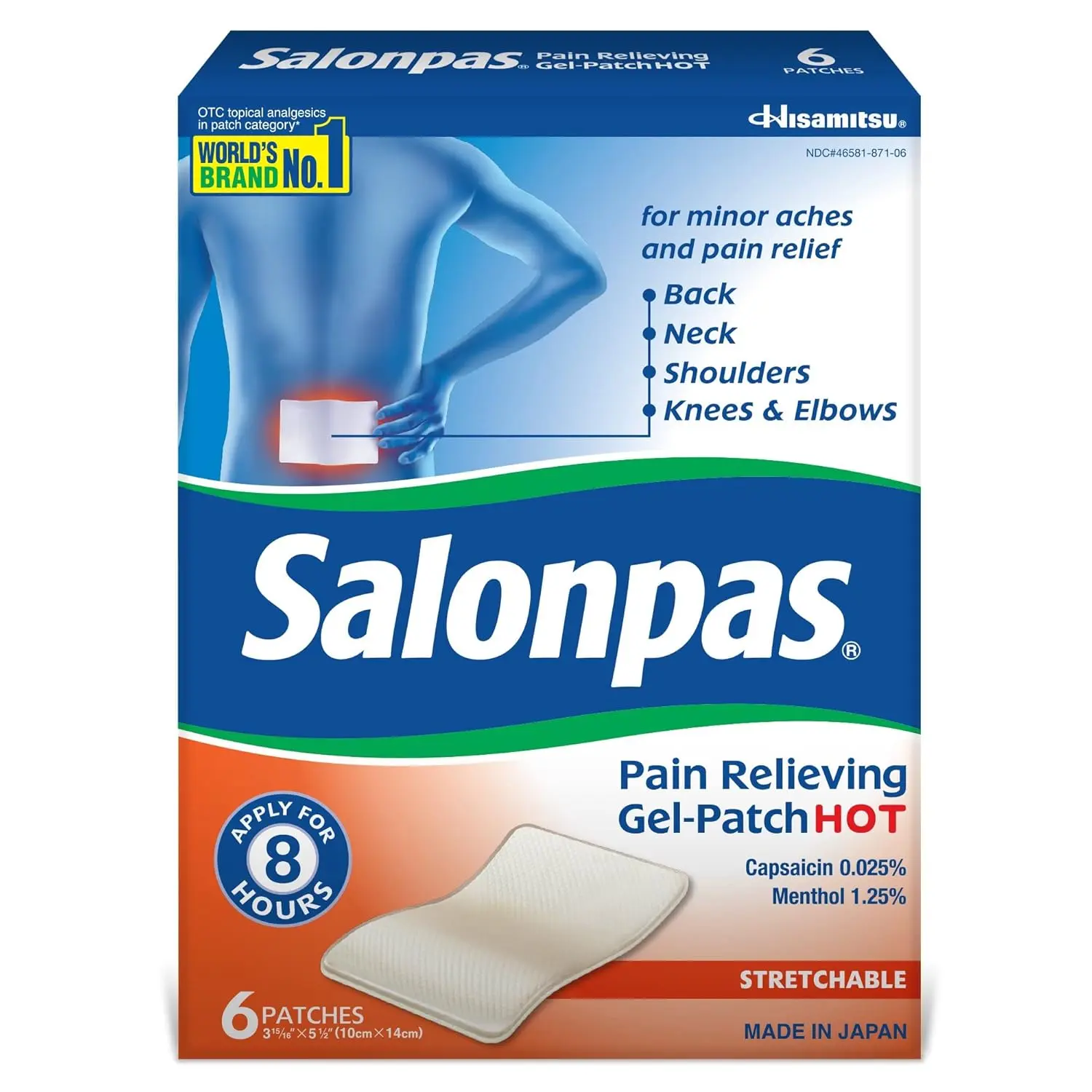 Salonpas Pain Relieving Gel-Patch Hot provides targeted relief for muscle and joint pain. These medicated patches deliver a warming sensation that soothes aches and pains, providing up to 8 hours of relief per patch. The convenient gel-patch design makes application easy and comfortable, conforming to your body for maximum effectiveness. Whether you’re suffering from back pain, neck pain, shoulder pain, knee pain, or muscle soreness from exercise, Salonpas Pain Relieving Gel-Patch Hot can help you get back to doing what you love. The patches are thin and discreet, so you can wear them comfortably under clothing. Experience the power of Salonpas for long-lasting pain relief. Salonpas Pain Relieving Gel-Patch Hot utilizes hydrogel technology which enhances skin adhesion with easy removal. The patches contain two powerful pain fighting ingredients: menthol and capsaicin. Menthol provides a cooling sensation to soothe pain and capsaicin provides a warming effect.