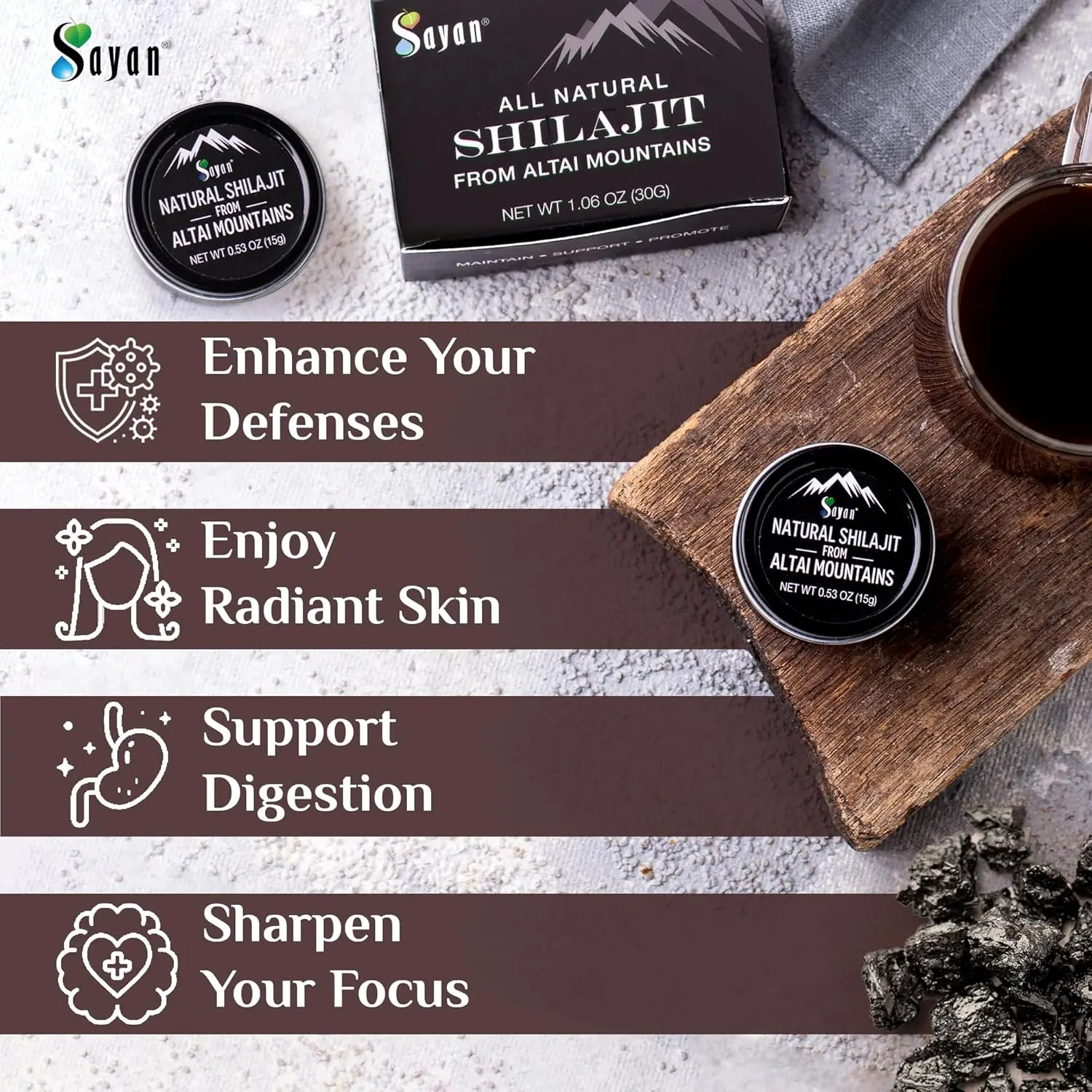 Experience the potent power of Sayan Fresh Pure Shilajit resin, sourced directly from the pristine Altai Mountains of Siberia at altitudes above 10,000 feet. This 100% pure Shilajit resin is free of fillers, additives, and artificial coloring, offering you nature’s best without compromise. Forget the hassle of measuring dosages – our easy-to-use resin seamlessly integrates into your daily routine. Unlock enhanced brain function and laser-sharp focus with this all-natural supplement.