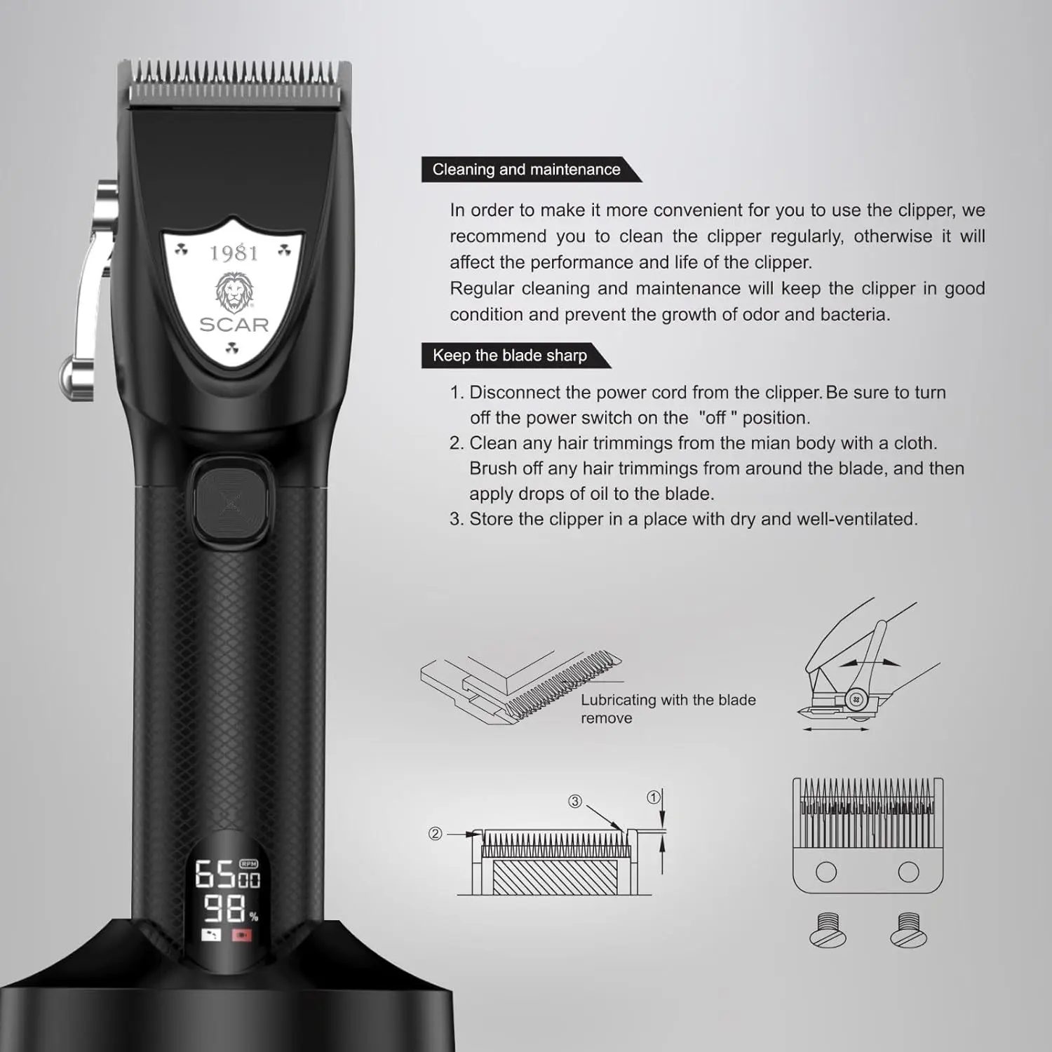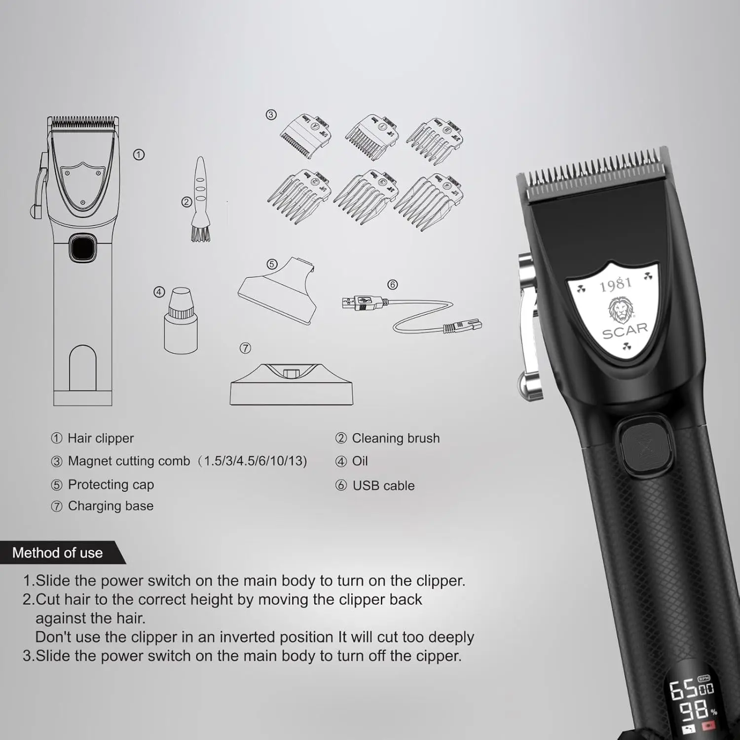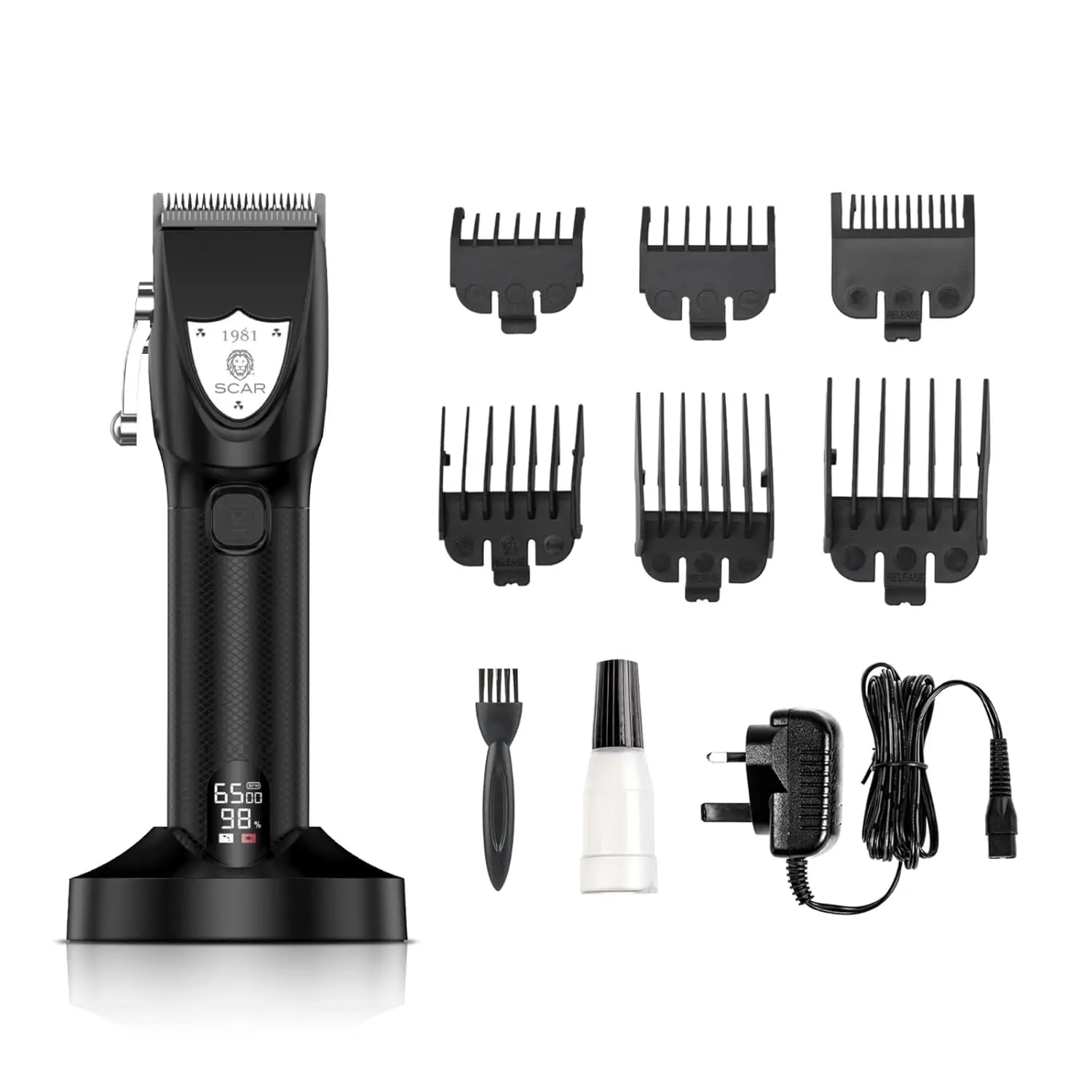 Achieve professional-grade haircuts from the comfort of your own home with the Scar Hair Clippers Professional Zero Gapped Cordless Kit. Engineered for precision and power, this heavy-duty clipper delivers impeccably clean and sharp results, eliminating uneven edges for a polished look every time. The zero-gapped design ensures ultimate closeness, allowing you to create fades, tapers, and intricate styles with ease. Enjoy the freedom of cordless operation, providing unrestricted movement and flexibility during your grooming routine. The rechargeable battery offers long-lasting performance, and the included USB cable and charging base make recharging simple and convenient. Stay informed with the integrated LED display, which provides real-time battery status and charging progress. This comprehensive kit includes everything you need for a complete grooming experience: an oil bottle for blade maintenance, a magnet cutting comb for precise length control, a cleaning brush for hygiene, and a convenient charging base for organized storage. Whether you’re a professional stylist or an at-home grooming enthusiast, the Scar Hair Clipper is designed to tackle even the thickest hair with ease and precision. Upgrade your grooming routine today with this professional-grade clipper that combines power, precision, and convenience.