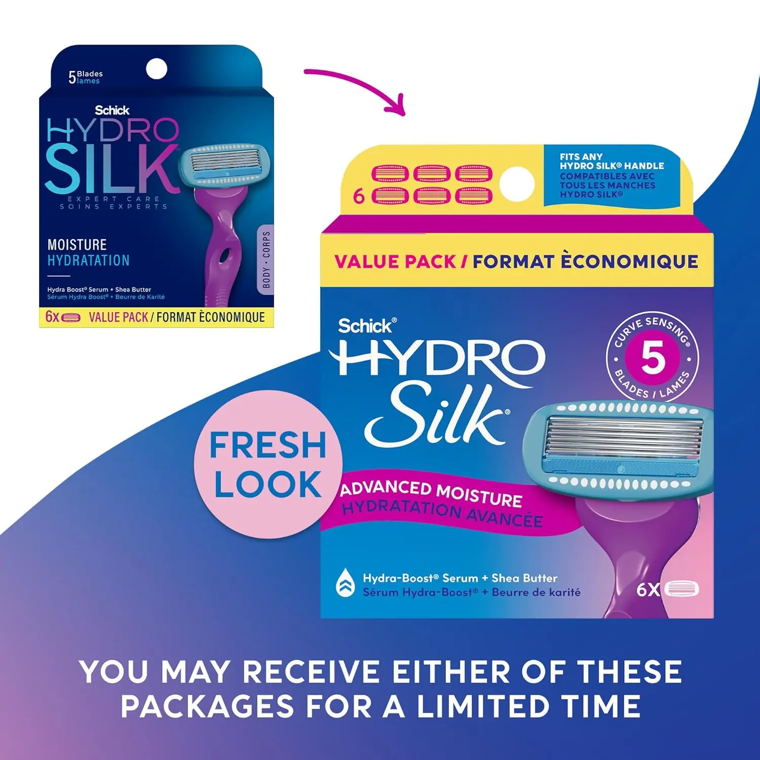 Experience the ultimate in smooth, hydrated skin with Schick Hydro Silk Razor Refills. Designed with your body’s curves in mind, these refills feature 5 curve-sensing blades that effortlessly glide over every contour, providing a close and comfortable shave. Unique skin guards ensure optimal contact with the skin while preventing irritation. What sets these refills apart is the Hydra-Boost serum, enriched with shea butter and hyaluronic acid, delivering our smoothest glide ever. Say goodbye to dryness and hello to lasting hydration, as these dermatologist-tested refills provide moisture for up to 2 hours after shaving. Each blade is equipped with a skin-protection coating, further minimizing irritation and maximizing comfort. For the perfect shaving routine, pair these refills with Schick Hydro Silk Shave Cream & 24-Hour Moisturizer. This pack includes 6 refills, compatible with all Hydro Silk handles. Achieve expert-level smoothness and embrace beautifully hydrated skin with Schick Hydro Silk. These refills are expertly designed to follow the contours of your body. Ideal for shaving legs, underarms, and bikini area. Enjoy the gentle and effective hair removal. The advanced formula promotes healthy looking skin. The moisturizing properties are carefully considered to ensure optimal comfort. You will have a great shaving experience with Schick Hydro Silk Razor Refills!