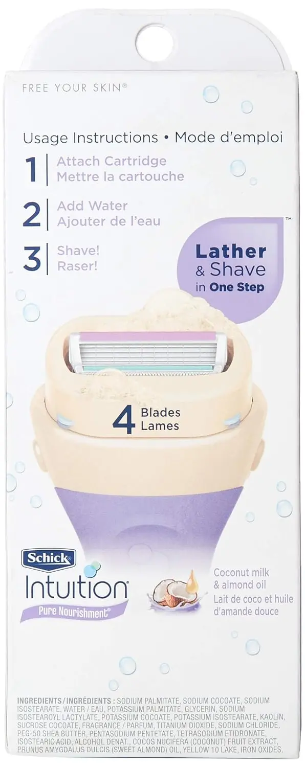 Experience effortless shaving with the Schick Intuition Coconut & Almond Razor 2-Pack. This innovative razor simplifies your routine by combining lather and shave in one easy step. Forget about separate shaving cream or gel! Simply attach the cartridge, add water, and you’re ready to go. The built-in moisturizing bar, infused with the nourishing goodness of coconut milk and almond oil, creates a rich lather that softens skin and allows the blades to glide smoothly for a close, comfortable shave. The pivoting head effortlessly follows your contours, ensuring every area is reached with precision. This 2-pack provides excellent value, ensuring you’re stocked up for weeks of smooth, irritation-free shaving. The Schick Intuition razor is designed for women who want a quick, convenient, and effective shaving experience without compromising on skincare. Enjoy the luxurious scent and silky-smooth results of coconut milk and almond oil while achieving beautifully shaved skin. Say goodbye to messy shaving creams and hello to the simple elegance of Schick Intuition. Enjoy a close, comfortable shave and moisturized skin all in one! This razor is perfect for sensitive skin and will leave you feeling soft, smooth, and refreshed. Simplify your routine with this amazing all-in-one razor. Get yours today and experience the difference! The moisture ribbon conditions and hydrates during shaving and leaves skin feeling soft. Get a close, comfortable shave without the need for shaving cream!
