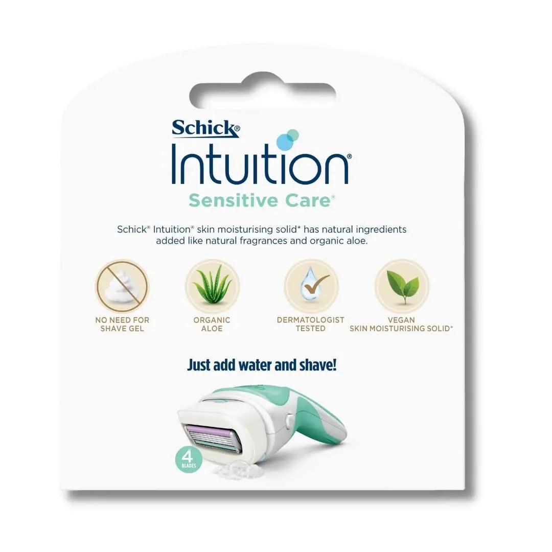 The Schick Intuition system is the simple and convenient way to achieve beautifully smooth legs. The built-in skin conditioning solid eliminates the need for separate shave gel or cream, streamlining your shaving routine and saving you time and money. Plus, the clever stand-up cap offers easy shower storage, keeping your razor clean and accessible at home or on the road. Enjoy a hassle-free shaving experience and reveal smooth, radiant skin with Schick Intuition Sensitive Care Razor Refills. They are the perfect solution for sensitive skin. The vitamin E helps to nourish and protect the skin. The aloe helps to soothe and moisturize the skin.