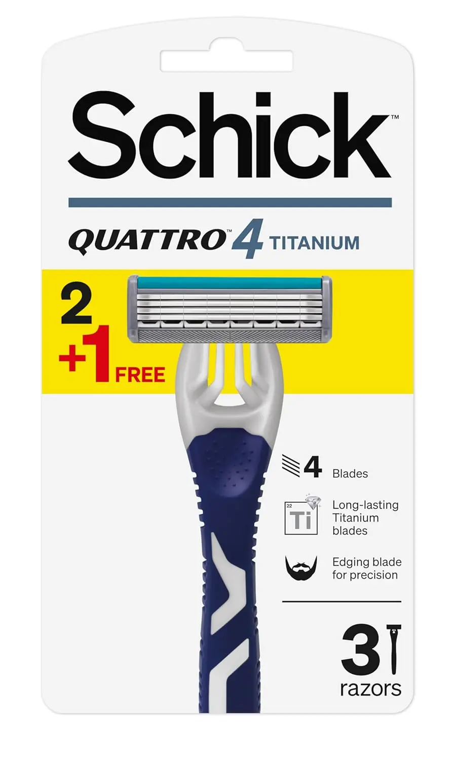 Experience a close, comfortable, and convenient shave with the Schick Quattro Titanium Disposable Razor. This razor combines the performance of a multi-blade system with the ease of a disposable, making it perfect for everyday use and on-the-go grooming. Featuring four precisely synchronized titanium-coated blades, the Quattro Titanium Disposable delivers an incredibly smooth and close shave, minimizing irritation and maximizing comfort. The lubricating strip, enriched with Aloe, Vitamin E, and Vitamin B5, helps to soothe and hydrate the skin, leaving it feeling soft and supple after each shave. The ergonomically designed handle with a ribbed rubber grip provides superior control and maneuverability, even in wet conditions, ensuring a safe and comfortable shaving experience. Enjoy a high-performance shave without the hassle of replacing cartridges with the Schick Quattro Titanium Disposable Razor – the perfect solution for a quick, clean, and comfortable shave anytime, anywhere. The added conditioning strip with aloe and vitamins helps calm the skin and keep it from being irritated. Get yours today for a great smooth shave at home or on the road!