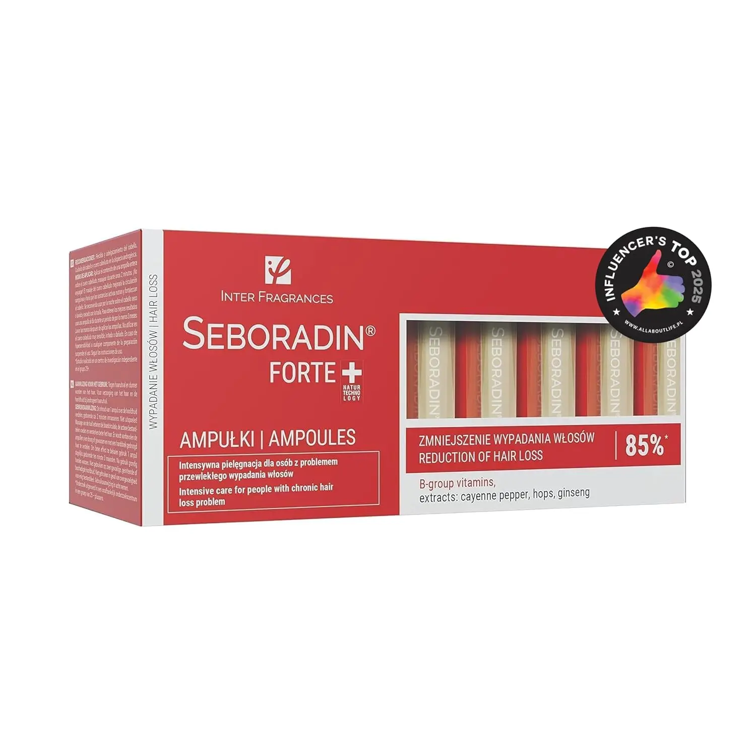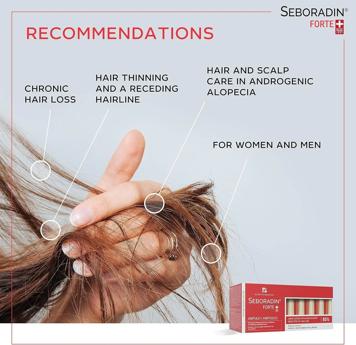 Fight hair loss and thinning hair with Seboradin Forte Hair Growth Serum! This powerful serum, designed for both men and women, is your solution for stronger, thicker, and healthier hair. Formulated with natural extracts like paprika, hops, ginseng, and B vitamins, this serum targets the root causes of hair loss, including androgenetic alopecia. Experience the benefits of improved scalp microcirculation through gentle massage, stimulating hair follicles for renewed growth. Seboradin Forte serum provides intensive care for chronic hair loss, working to prevent further thinning and breakage. Its innovative formula is designed for daily use and won’t weigh your hair down or leave it sticky. Incorporate it into your routine with Seboradin Forte shampoo, balm, lotion, and mask for optimal results. See a visible reduction in hair loss and enjoy softer, smoother, and more resilient hair! This serum is perfect for all hair types seeking to combat hair loss and improve overall hair health. Achieve visible results of hair growth and volume by using the serum with the other products of Seboradin Forte.