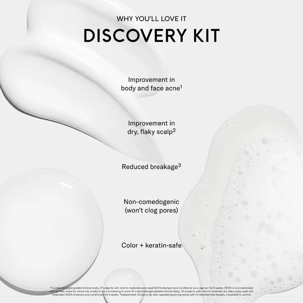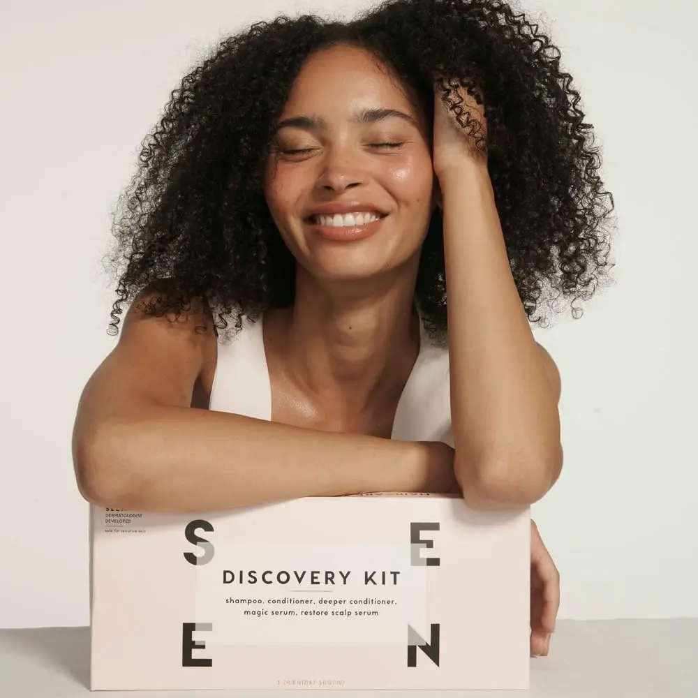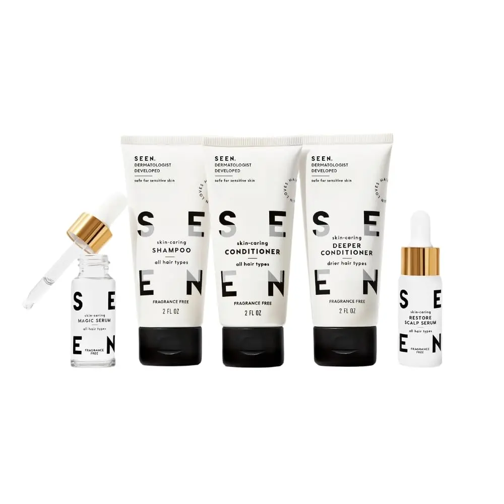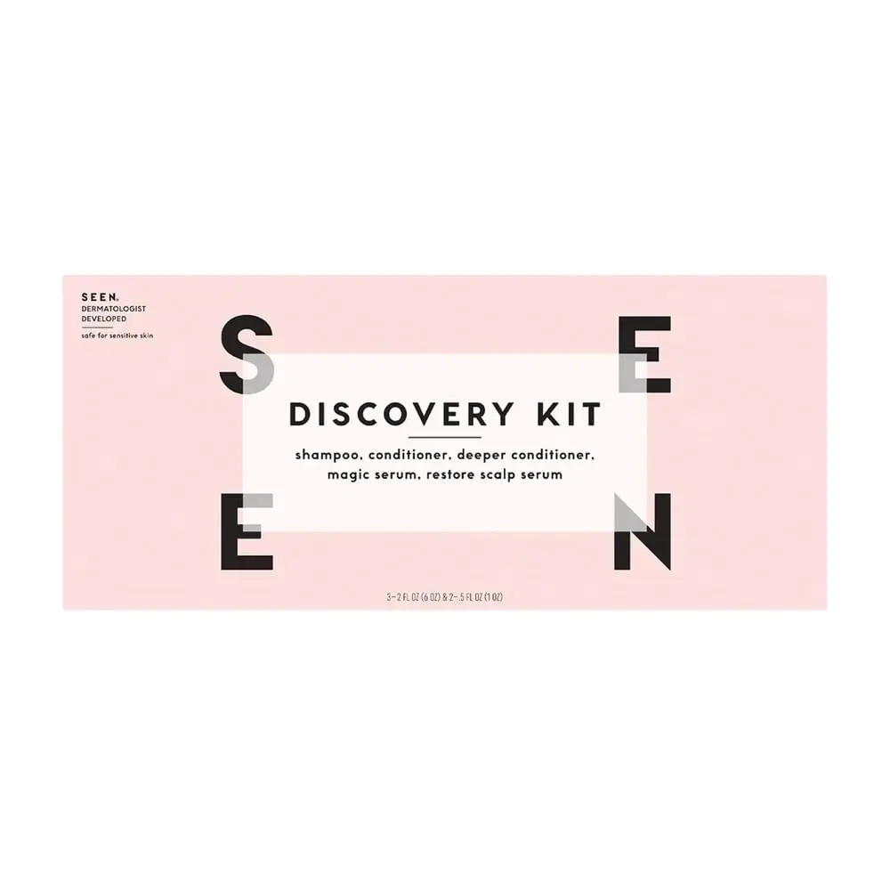 Discover the SEEN Discovery Kit, featuring five of our best-selling hair and scalp products in convenient travel sizes. This kit is perfect for trying SEEN for the first time, traveling, or gifting. Inside, you’ll find: Shampoo (2 oz.), Conditioner (2 oz.), Deeper Conditioner (2 oz.), Magic Serum (.5 oz.), and Restore Scalp Serum (.5 oz.).