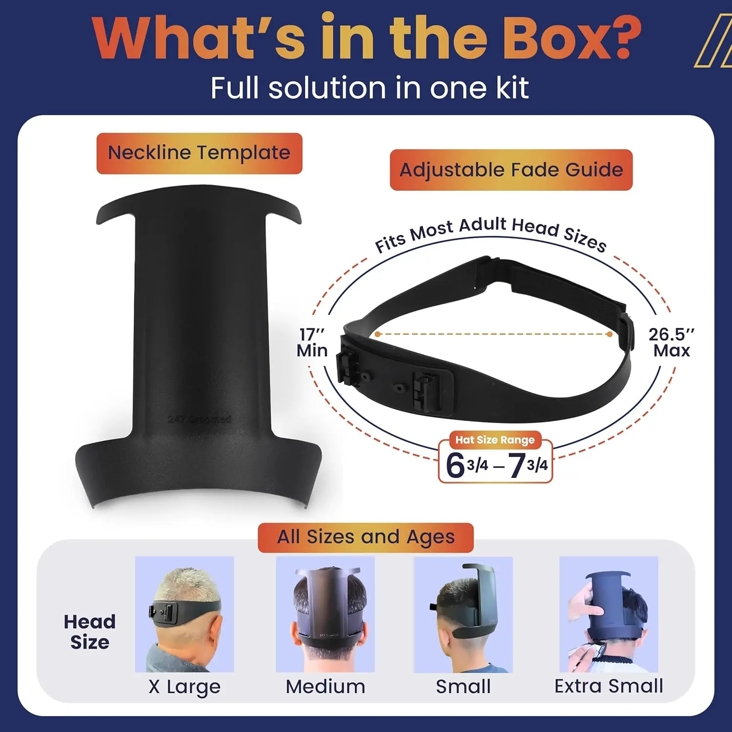 Create flawless fades with our innovative fade haircut tool. Whether you prefer flat or curved lines, this tool helps you achieve the perfect fade with precision. It’s suitable for both kids and adults, making it a versatile addition to your grooming routine. Our fade guide empowers you to confidently perform self haircuts or help others achieve their desired look. The hair cut guide for men offers a comfortable fit for head sizes ranging from XS to XXL. It sits snugly without causing uncomfortable stretching, ensuring a smooth and controlled haircutting experience. It’s the perfect companion to your 360 mirror and fade comb, completing your self-grooming arsenal.