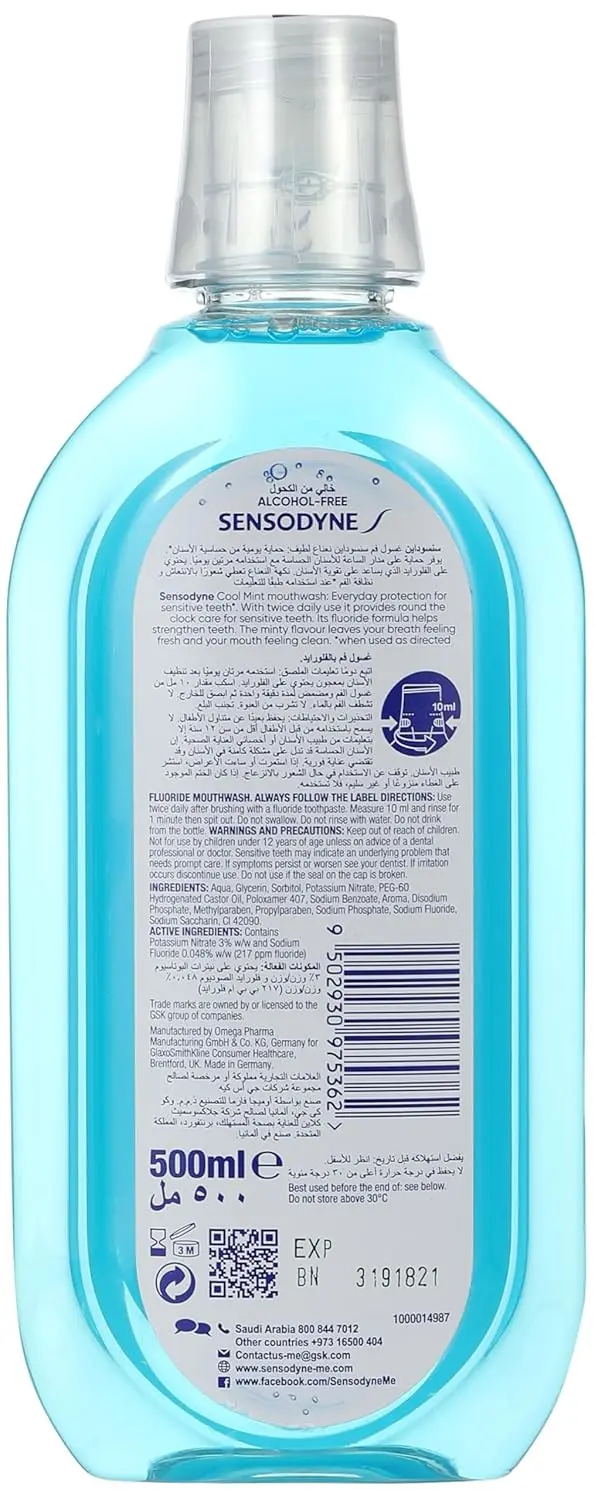Sensodyne Cool Mint Mouthwash offers everyday protection against tooth sensitivity. This alcohol-free formula is designed for twice-daily use after brushing with a fluoride toothpaste. It works by targeting the source of sensitivity, reaching inside the tooth to build a protective layer around the nerve. This soothing action helps to reduce the discomfort caused by hot, cold, sweet, or sour stimuli. Beyond sensitivity relief, Sensodyne Cool Mint Mouthwash also provides essential fluoride to strengthen teeth and help prevent cavities. The refreshing cool mint flavor leaves your breath feeling fresh and your mouth feeling clean, promoting overall oral hygiene. Incorporating this mouthwash into your daily routine can significantly improve your comfort and confidence, allowing you to enjoy your favorite foods and drinks without the worry of sensitivity pain. Its gentle yet effective formula makes it suitable for daily use, providing continuous protection and promoting healthy gums. Regular use of Sensodyne Mouthwash Cool Mint will allow you to enjoy a long lasting clean that ensures the complete dental health. This product is a very important product for the people that feel the discomfort of the teeth and gums. Sensodyne is the number 1 recommended brand.