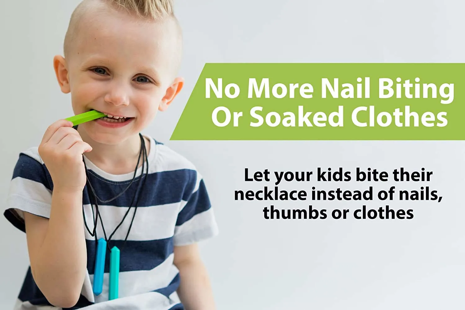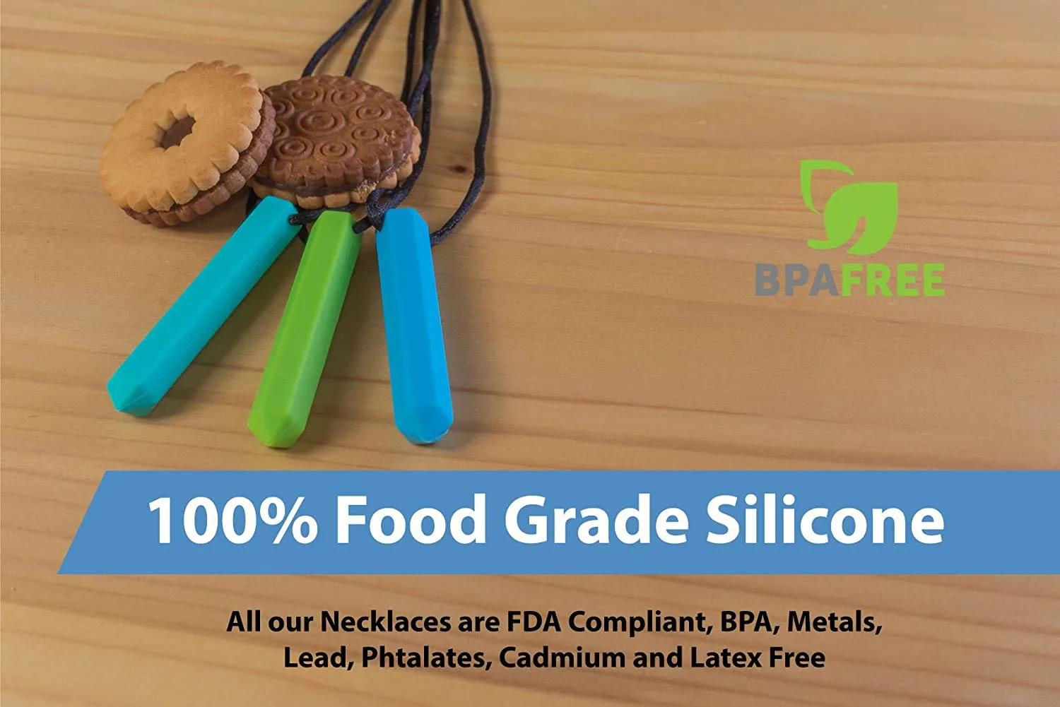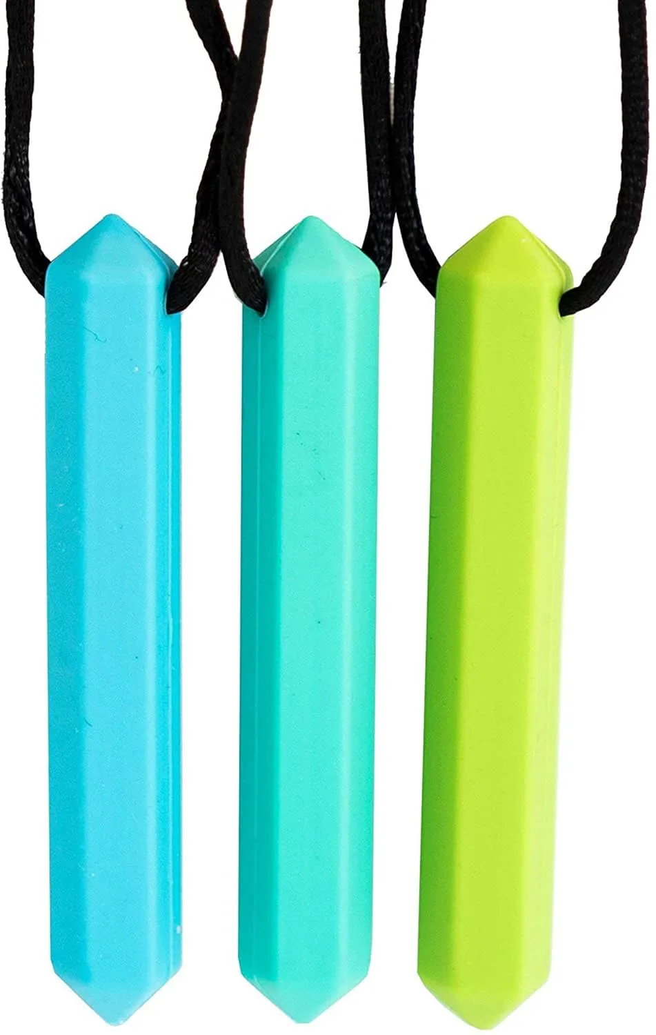 This 3-pack of Sensory Chew Necklaces offers a safe and discreet way to satisfy chewing needs for individuals of all ages. Made from durable, food-grade silicone, these pendants provide a calming and therapeutic effect, perfect for those with anxiety, ADHD, autism, or sensory processing disorder. The textures provide tactile stimulation, redirecting potentially harmful habits like nail-biting or thumb-sucking. Each necklace features a breakaway clasp for added safety, preventing choking hazards. These chews are not just for kids! Many adults find them helpful for managing stress and focusing attention. Available in calming colors designed to reduce stress and anxiety. They are also ideal for teething babies and toddlers who need a safe and clean way to soothe sore gums. Give yourself or your loved one the gift of a sensory outlet with these versatile and helpful chew necklaces. They are free of harmful chemicals like BPA, latex, phthalates, and lead, ensuring a safe and enjoyable experience. Plus, our 30-day money-back guarantee ensures your satisfaction! These necklaces help with managing fidgeting, nail biting, and redirecting focus in a discrete and safe way. Our customers love using this during work meetings and school to help manage their focus. Chewing is a very normal thing for people who need to focus or are under lots of stress. Our chews are perfect for this.