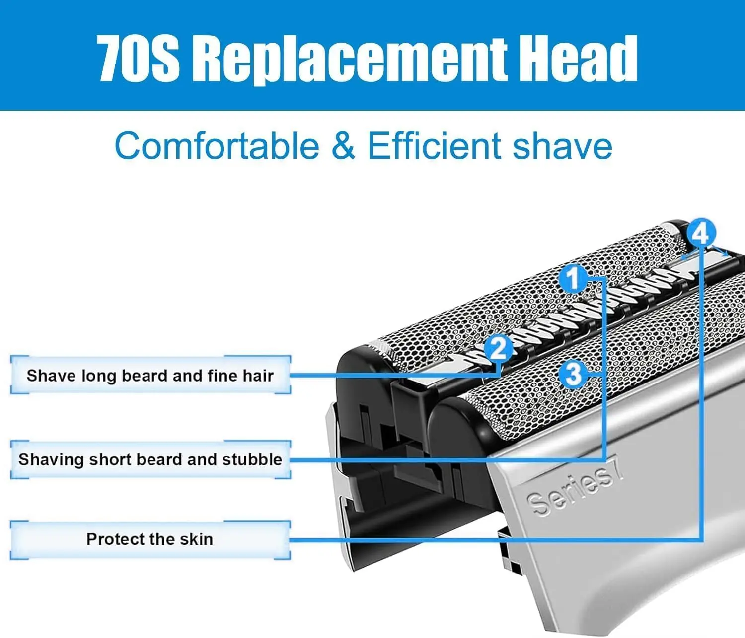 Restore your Braun Series 7 shaver to its peak performance with the 70S Series 7 Shaver Head Replacement. Crafted from fine quality materials with a robust structure, this replacement head ensures a long and reliable service life, providing a comfortable and safe beard grooming experience with minimal irritation. This compatible replacement head is designed for Braun Series 7 electric razors, including models 70s, 790CC, 720, 750CC, 760CC, and 9565. Replacing your worn or damaged razor head will effectively revitalize your shaver, bringing it back to like-new condition. Regular cleaning is crucial for maintaining optimal performance, and it is recommended to replace your shaving blades every 6 months to ensure a consistently close and comfortable shave. Experience a return to 100% shaver performance, enjoying a faster, smoother, and more thorough shave with this replacement head. Please note that this product is a compatible replacement head, not a genuine Braun product. However, it delivers comparable performance and shaving results, providing excellent value and reliability. The durable construction and precision engineering of this replacement head make it an ideal choice for extending the life of your Braun Series 7 shaver and maintaining a consistently high-quality shave.