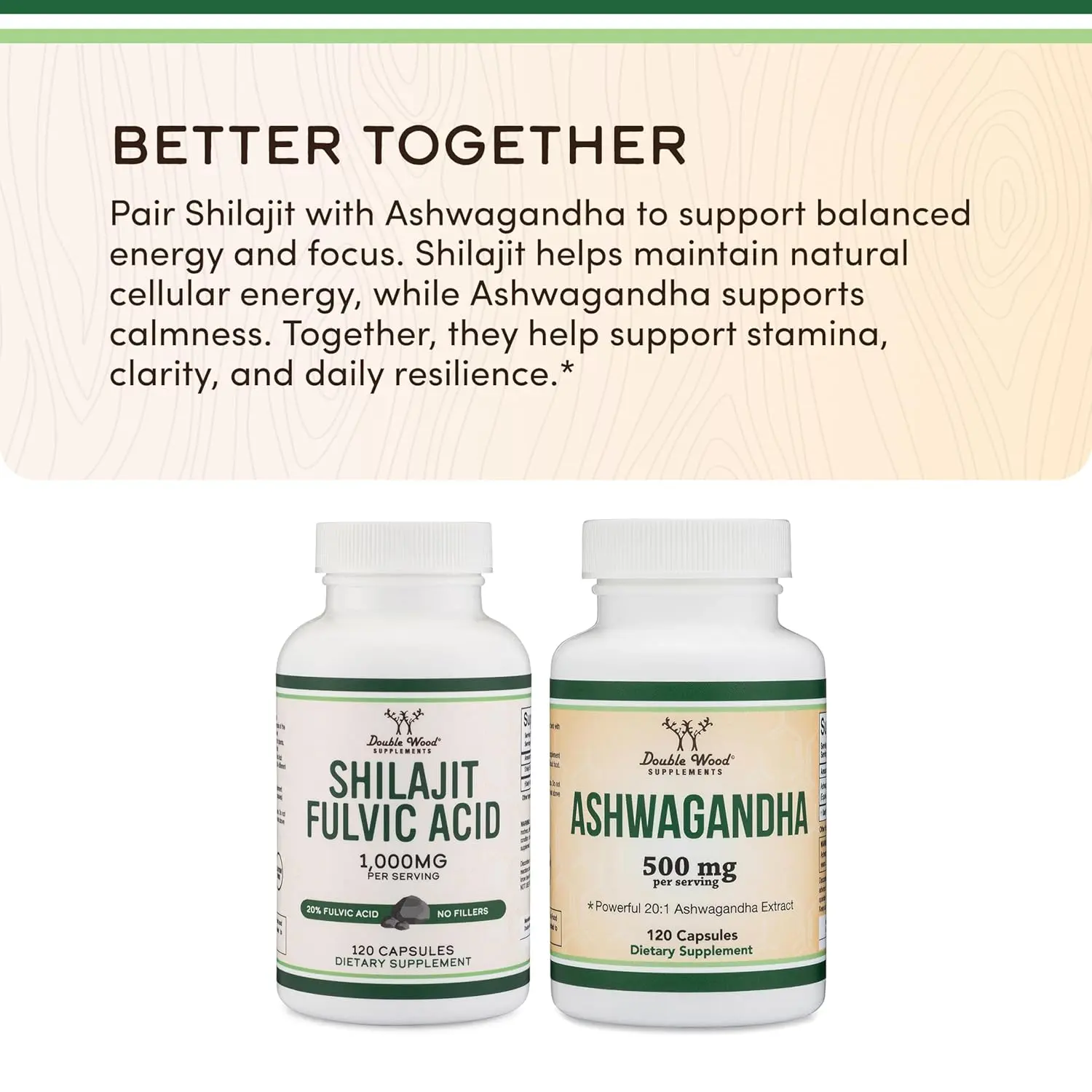 Our Shilajit capsules are made with pure Himalayan Shilajit powder and contain no fillers, binders, or artificial ingredients. We believe in providing you with the most natural and effective supplement possible. Double Wood takes pride in manufacturing and testing our Shilajit resin supplement in the USA, adhering to strict quality control standards. Our product is also vegan-friendly, gluten-free, and non-GMO, making it suitable for a wide range of dietary needs. Experience the difference that pure, potent Shilajit can make in your life.