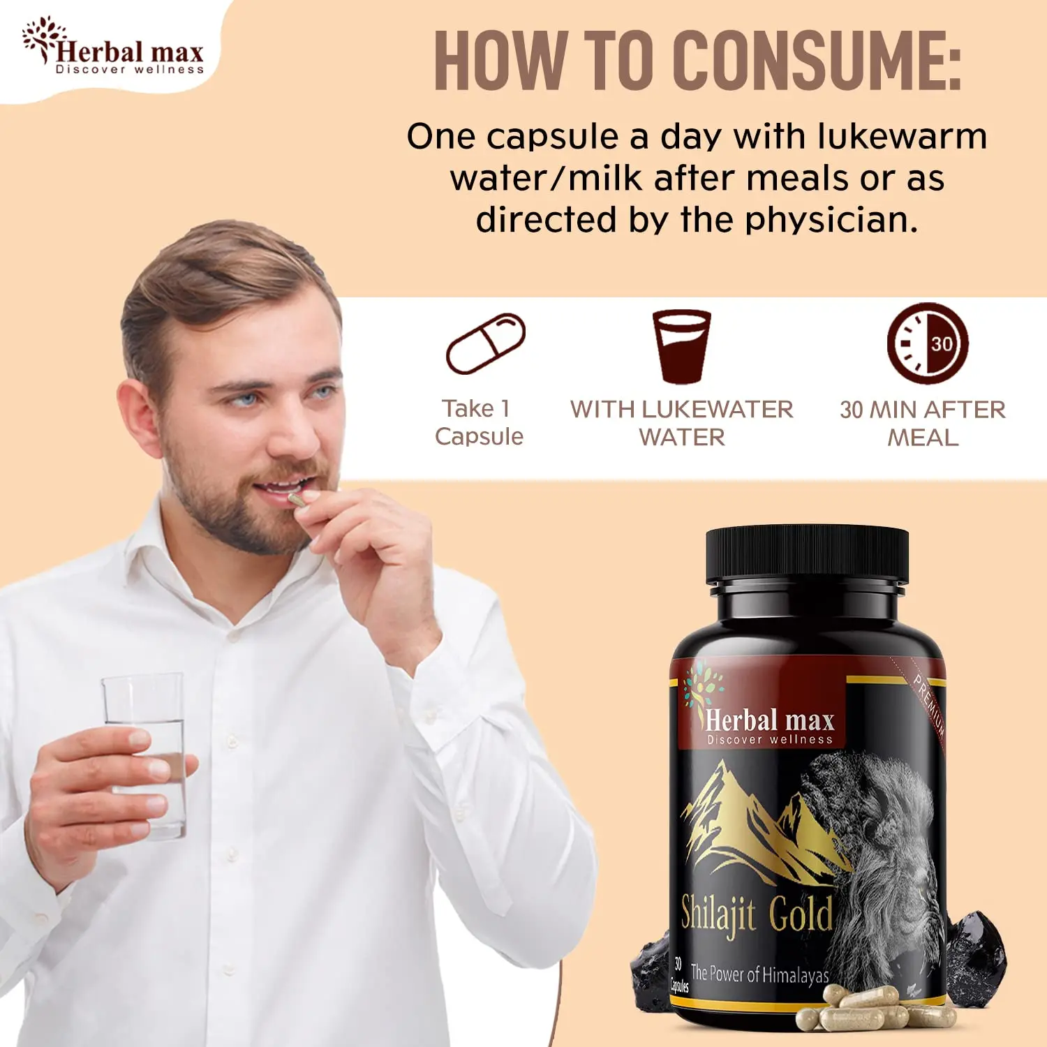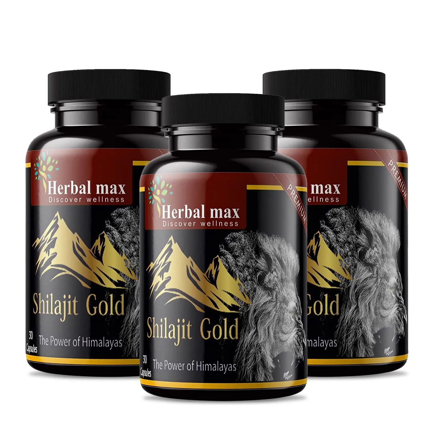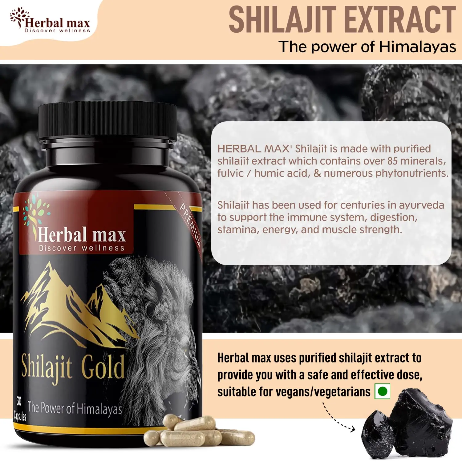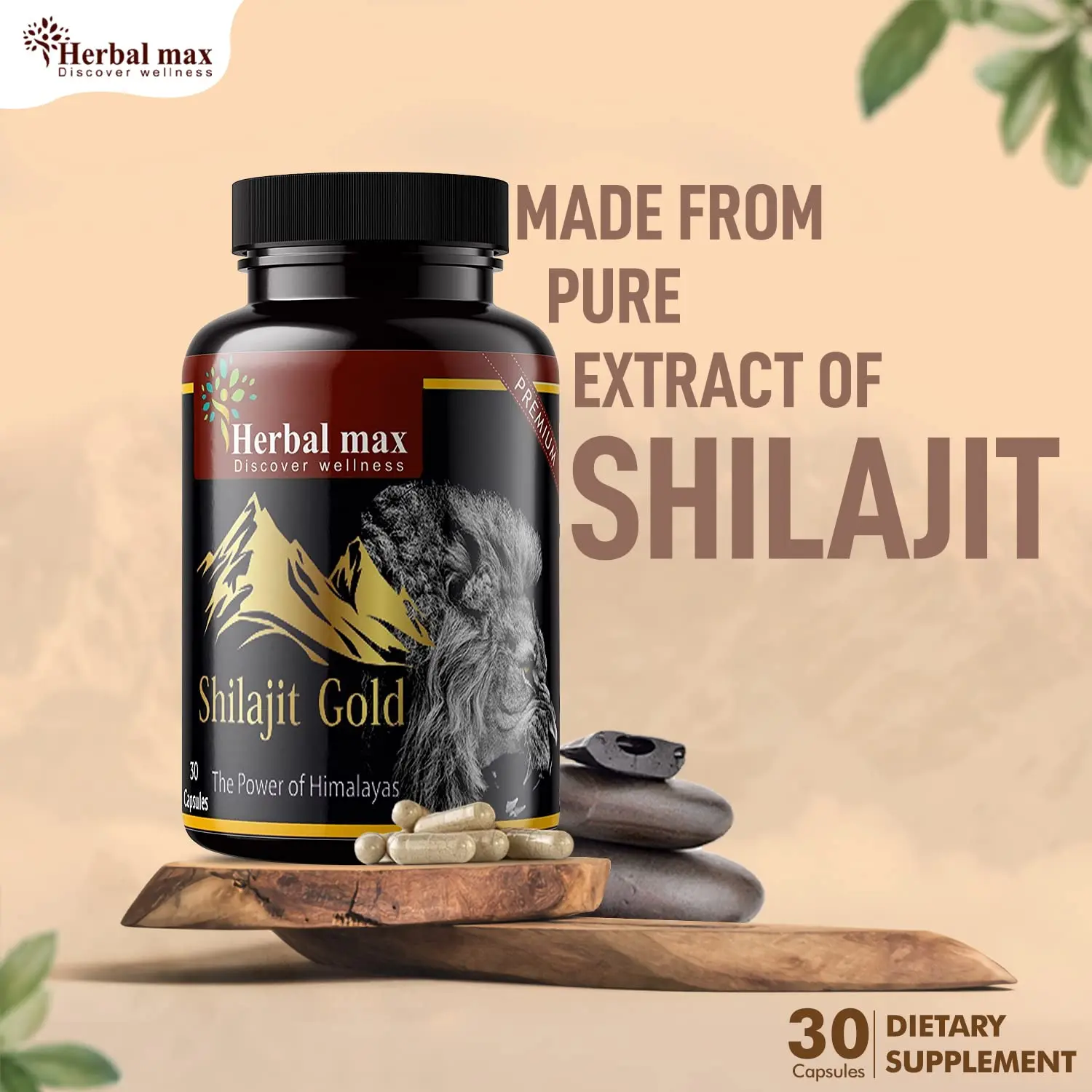 Unlock your potential with Shilajit Gold Extract Capsules from Herbal Max! Used for centuries in Ayurveda to promote longevity and vitality, Shilajit is a natural substance found at high altitudes. Our 100% authentic Shilajit extract powder is meticulously hand-harvested to ensure unparalleled purity and potency. Experience the natural benefits of Shilajit in convenient capsule form. Boost your energy levels, support healthy aging, and revitalize your overall well-being. This natural supplement aids in energy management, helping you power through your day with sustained vigor. Embrace the ancient wisdom of Ayurveda and elevate your health journey with Shilajit Gold Extract Capsules.