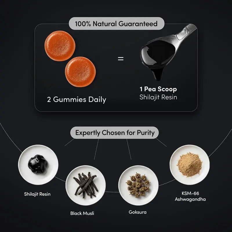 Unlock your peak potential with Shilajit Gummies, expertly crafted with KSM-66 Ashwagandha for enhanced stamina and sustained energy. Sourced from the pristine heights of the Himalayas (18,000 ft), our pure, organic Shilajit resin delivers nature’s best in a potent, convenient gummy form. Experience the synergistic power of Shilajit combined with KSM-66 Ashwagandha, Gokshura, Black Musli, and Ginseng. This unique formulation supports overall wellness, enhances workout routines, and aids in rapid recovery. Featuring “ShilAbsorb,” our patented and trademarked blend boasts “3.5X Higher Bioavailability” and “75%+ Fulvic Acid” compared to standard resin, ensuring optimal absorption and effectiveness.