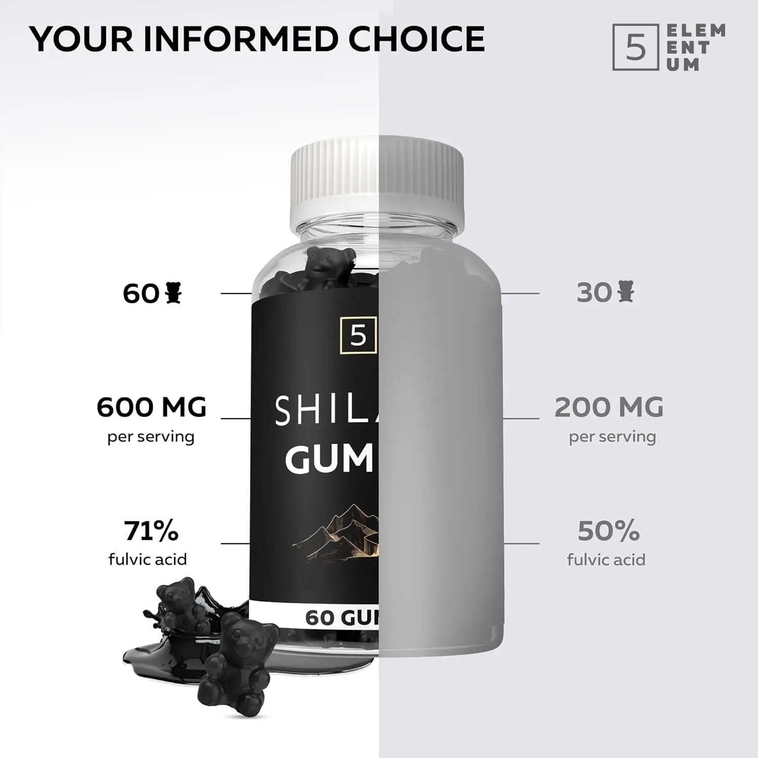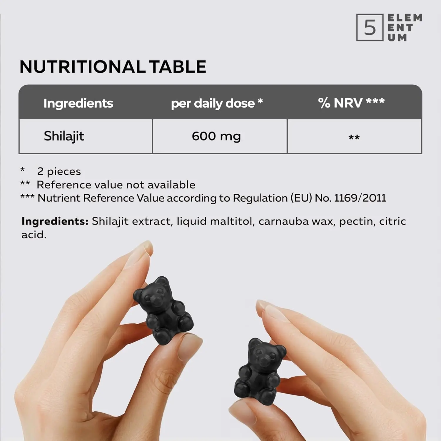 Boost your energy and vitality with our Shilajit Gummies! These delicious and easy-to-take gummy bears are packed with 300mg of high-dose Shilajit and 71% fulvic acid per serving, providing optimal support for your overall well-being. Our gummies are 100% natural and vegan, with no added sugar, making them a guilt-free way to incorporate the benefits of Shilajit into your daily routine. We ethically extract our Shilajit, ensuring respect for nature and its resources. Each tin contains 60 gummy bears, a 30-day supply perfect for on-the-go or at-home use. Designed to naturally promote your energy levels and overall well-being. Ideal for active individuals or those seeking to recover and strengthen their health. Our Shilajit gummies are a convenient and tasty way to experience the power of this ancient substance. Enjoy the pleasant taste and soft texture, making your daily dose of Shilajit a treat. Prioritize your health and well-being with our carefully crafted Shilajit Gummies. Note: Consult with your doctor before use if you are pregnant, breastfeeding, taking medication, or have a medical condition. Do not exceed the recommended daily dose. Keep out of reach of children. Store in a cool, dry place away from direct sunlight. These gummies are not a substitute for a balanced diet and healthy lifestyle.