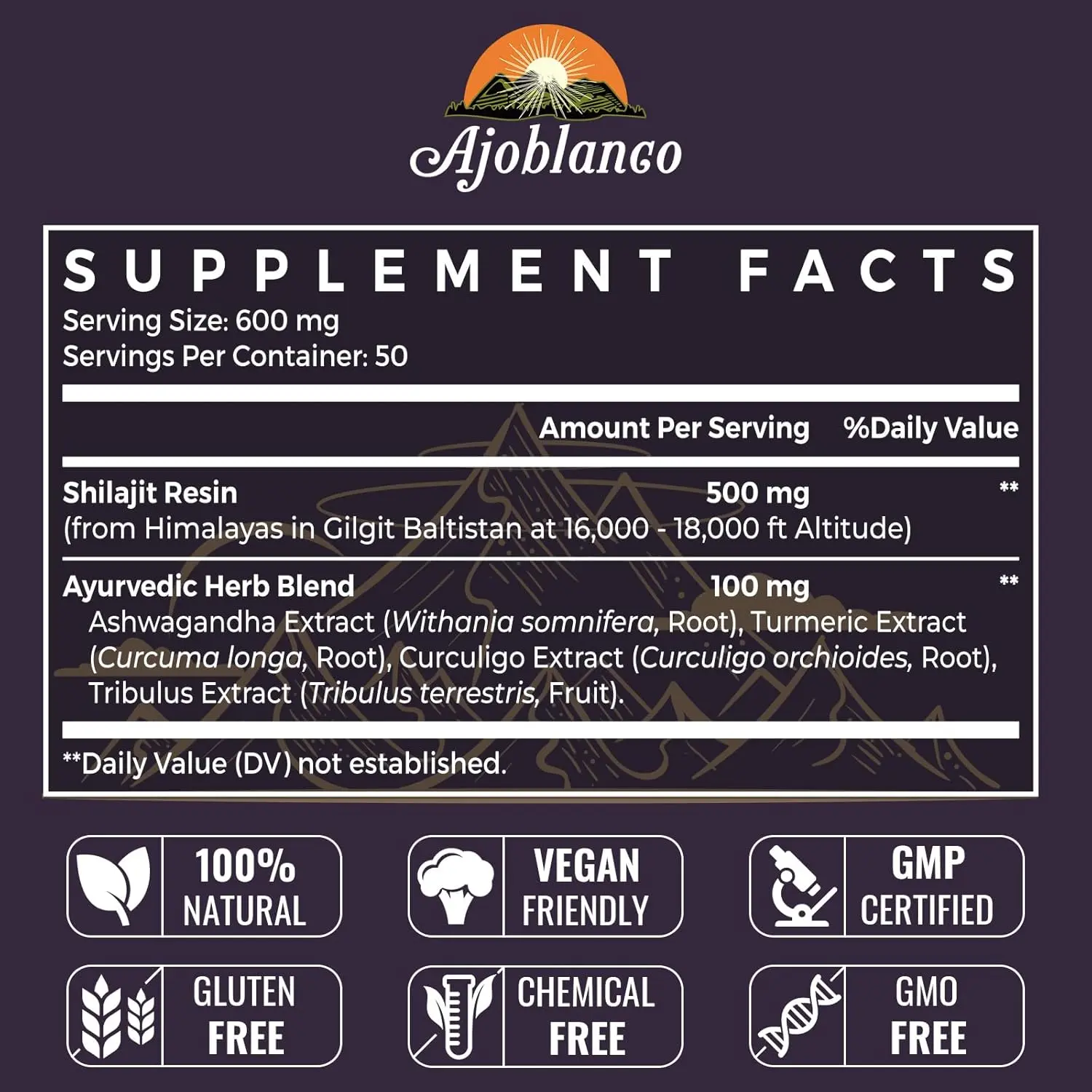 Experience the power of nature with our Shilajit Himalayan Organic Resin, meticulously sourced from the pristine heights of Gilgit-Baltistan (18,000 feet!). This Ajoblanco shilajit, a golden grade resin, is deeply rooted in Ayurvedic traditions, delivering a potent blend of 85+ essential minerals and fulvic acid. Embark on a journey to holistic wellness, enhanced by a thoughtfully curated blend of Ayurvedic herbs. Each 600mg serving provides daily support for energy levels, strength, and a robust immune system. We are committed to Grade A purity and potency standards, ensuring you receive superior shilajit resin of exceptional quality. Discover the transformative difference of authentic Ayurvedic ingredients and unlock your body’s full potential. Our Shilajit Resin is more than just a supplement; it’s a commitment to a balanced and thriving lifestyle. Harness the ancient wisdom of Ayurveda and elevate your well-being.