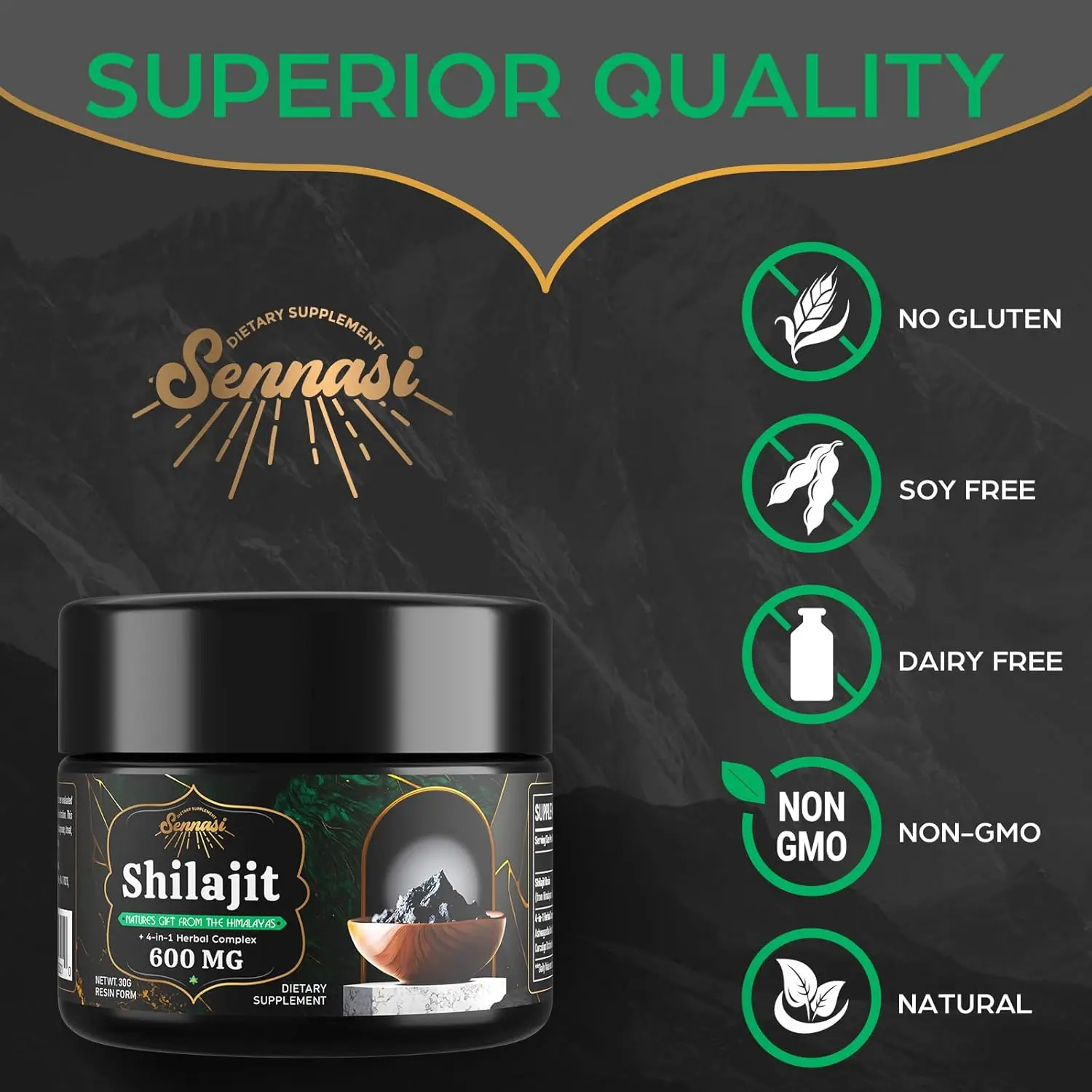 Unlock the ancient power of the Himalayas with Sennasi Shilajit Resin. This potent, all-natural supplement is meticulously hand-harvested from the pristine Gilgit-Baltistan region at altitudes of 16,000 – 18,000 feet, ensuring unparalleled purity and potency. Our 4-in-1 herbal complex combines pure Himalayan shilajit resin with fulvic acid and over 85 trace minerals, offering a holistic approach to revitalizing your body and mind. Experience enhanced energy levels, strengthened immunity, improved digestion, and cognitive support with this remarkable Ayurvedic treasure. Each serving delivers 600mg of shilajit resin, carefully measured for optimal efficacy. Sennasi Shilajit Resin is your gateway to a balanced and vibrant lifestyle, free from fatigue and brimming with vitality. Sourced from rare gold-grade shilajit, our resin is processed using non-chemical extraction methods, guaranteeing a pure, potent, and additive-free supplement. Elevate your well-being with the natural power of Sennasi Shilajit.