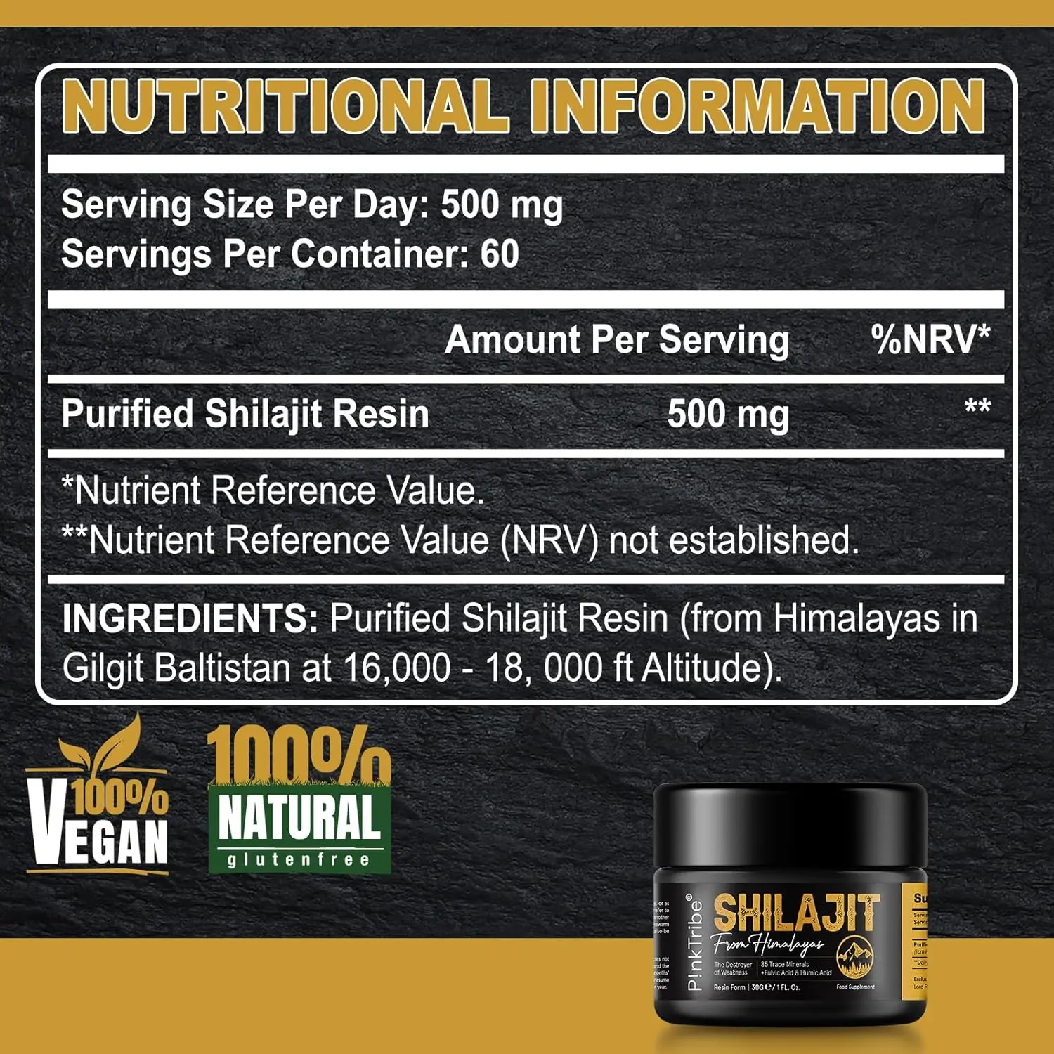 Experience the unparalleled power of nature with P!nkTribe Shilajit Resin, sourced directly from the pristine altitudes of the Himalayan Mountains (16,000 feet). Our gold-grade shilajit is meticulously harvested and purified, ensuring the highest quality and potency. P!nkTribe personally oversees every step, from selection to purification, to bring you an authentic and effective shilajit supplement. This potent resin is packed with beneficial phytocompounds, including fulvic acid and humic acid, and boasts up to 85 trace minerals essential for overall well-being. Traditionally used as an herbal remedy, shilajit nourishes various parts of the body, supporting energy levels, stamina, and overall vitality. Our shilajit is presented in its purest form – a thick, tar-like goo, minimally processed and free from heavy metals, fillers, and additives. It’s also vegan-friendly. P!nkTribe shilajit resin has undergone rigorous safety testing by a professional organization, guaranteeing a 100% quality guarantee. Each jar contains 30 grams, providing a two-month supply. We recommend taking a pea-sized amount (approximately 500mg) daily, dissolved in warm water, milk, tea, or your favorite beverage. For enhanced absorption, it can also be taken directly under the tongue. Particularly beneficial for men, shilajit is renowned for its positive impact on stamina, strength, and energy levels. Trust P!nkTribe to deliver authentic, high-quality shilajit and unlock the true potential of this ancient remedy. Discover the transformative benefits of P!nkTribe Shilajit Resin and elevate your well-being.