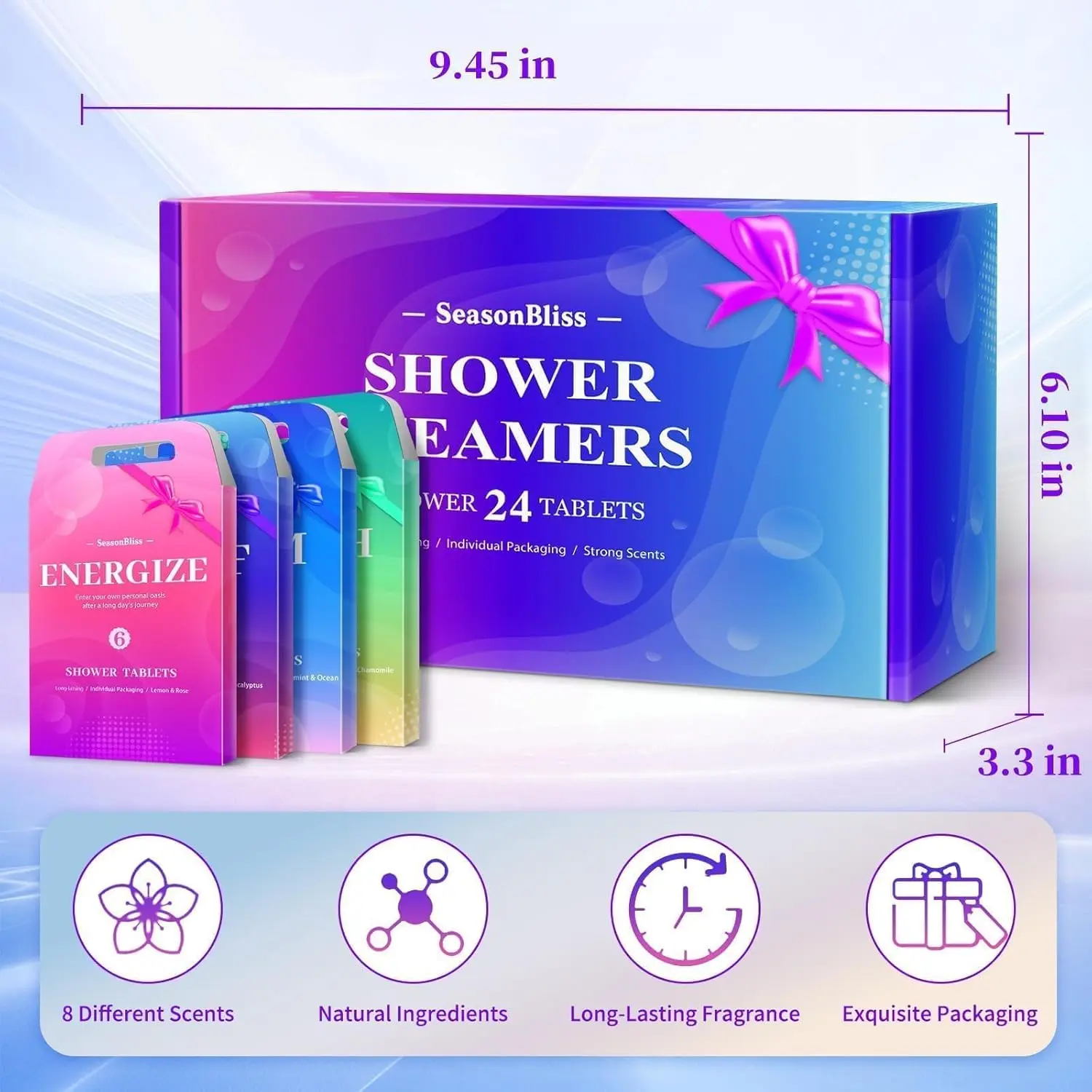 Experience the delight of long-lasting fragrance that envelops your senses and lingers on your skin, leaving you feeling refreshed and subtly scented. These shower steamers provide a generous and luxurious experience, making them a thoughtful present option for your loved ones. Surprise your family and friends with a gift that promotes relaxation, well-being, and a touch of everyday luxury. The exquisite packaging and safe formula make our 24-pack shower tablets an impressive and pampering present choice that will undoubtedly be appreciated. Elevate your shower routine and immerse yourself in the world of aromatherapy with our premium shower steamers. Enjoy a different fragrance every day, tailored to your mood and designed to enhance your overall well-being.