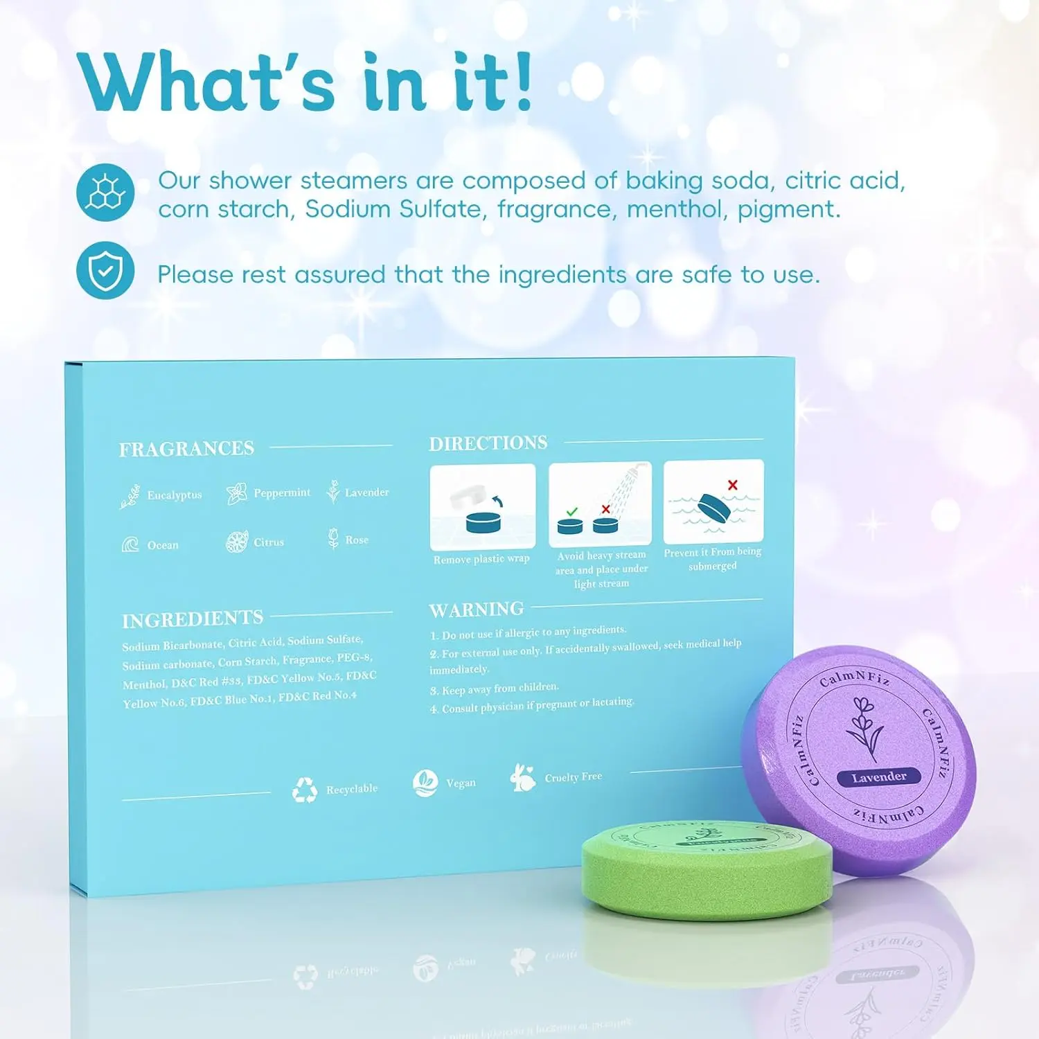 CalmNFiz Shower Steamers offer 6 unique scents for an enjoyable shower experience. Individually wrapped for freshness and easy travel, they make a perfect gift for any occasion.