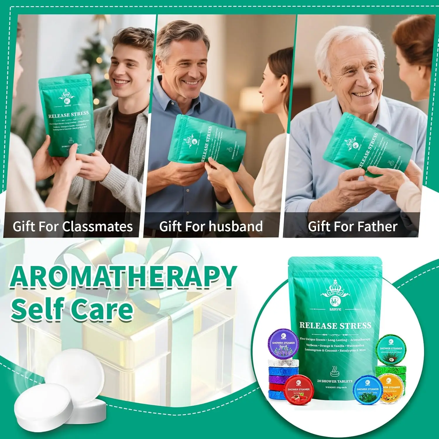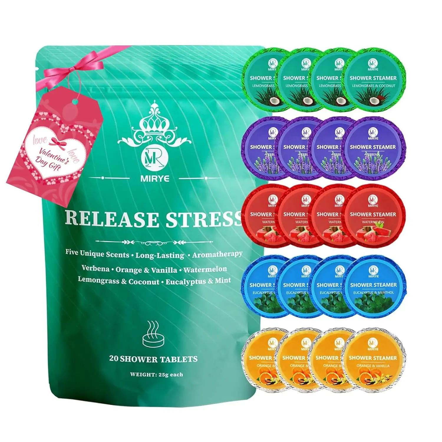 Transform your daily shower into an aromatherapy spa experience with the MIRYE Shower Steamers Aromatherapy Gift Set. We’ve taken the best of shower tablets and elevated them to a new level of fragrant bliss, allowing you to slow down and savor moments of relaxation. Forget the stress of the day and indulge in a home spa experience right in your own shower. This 20-pack of shower tablets features five popular scents, each carefully crafted with natural and organic essential oils. Discover the invigorating Verbena, the uplifting Orange & Vanilla, the refreshing Watermelon, the revitalizing Lemongrass & Coconut, and the soothing Eucalyptus & Mint. Each scent comes with 4 individually wrapped tablets, ensuring a fresh and potent aromatherapy experience every time. More than just a shower accessory, these shower steamers offer a simple yet effective way to release stress and promote well-being. The natural essential oils work their magic as they dissolve, filling your bathroom with captivating aromas that help you relax and take the edge off a busy day. Our aromatherapy shower bombs are a perfect gift for anyone who deserves a little pampering. The beautiful packaging makes them ideal for gifting without the need for any re-wrapping. Whether it’s Christmas, a birthday, or just a gesture of self-care, these shower steamers are sure to be a hit. They make thoughtful Christmas gifts for women, stocking stuffers for women or men, self care gifts for women, bridesmaid gifts, birthday gifts for women or men, or gifts for mom gifts for women. We are committed to providing excellent service to our customers. If you have any questions about our products, please do not hesitate to contact us. We will respond within 24 hours. Treat yourself or a loved one to the gift of relaxation with MIRYE Shower Steamers. Turn your ordinary shower into an extraordinary escape! Experience the aromatic difference today.