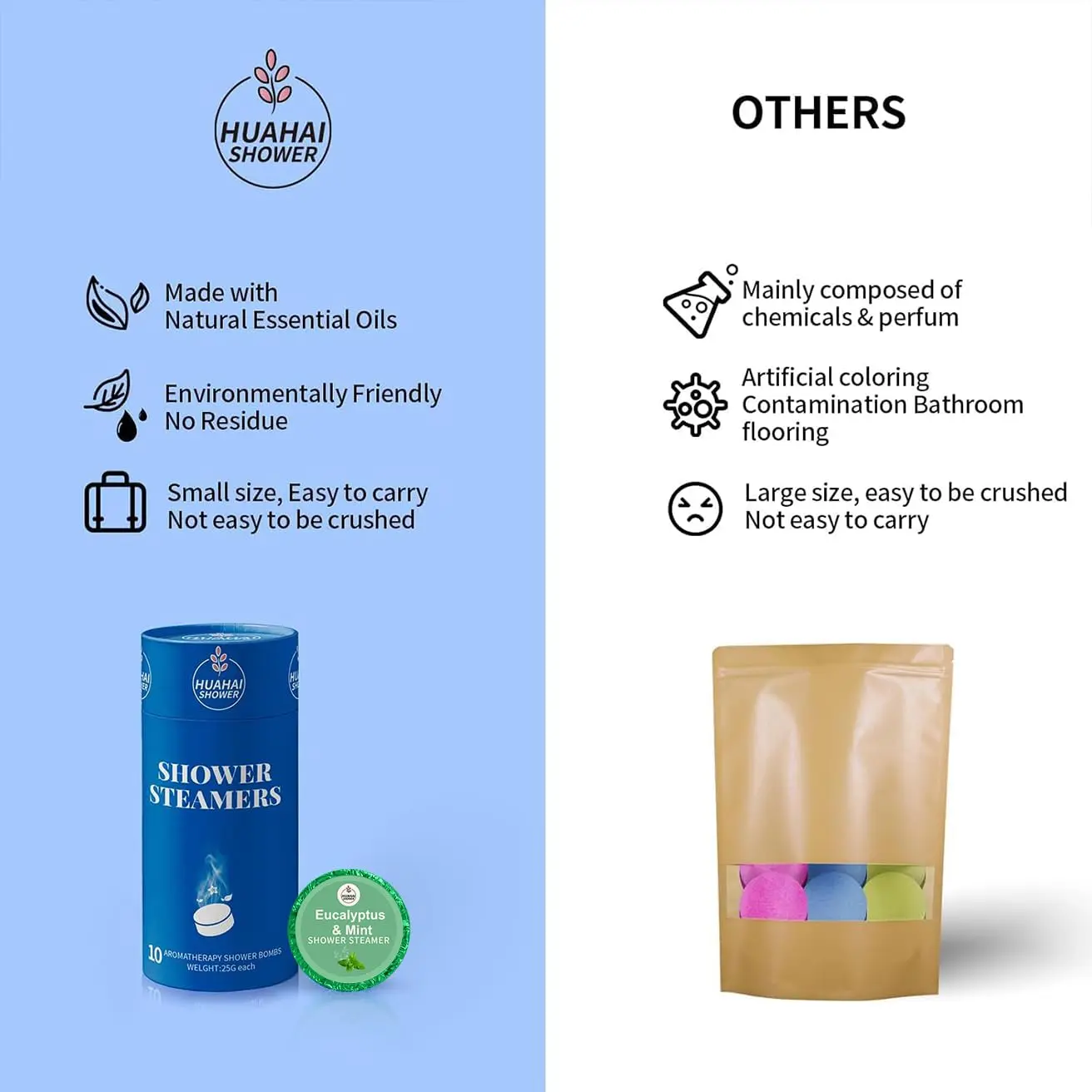 HUAHAI shower steamers are compact and designed for portability. Their small size makes them ideal for travel, ensuring you can enjoy a relaxing aromatherapy experience wherever you go, whether on a business trip or vacation.