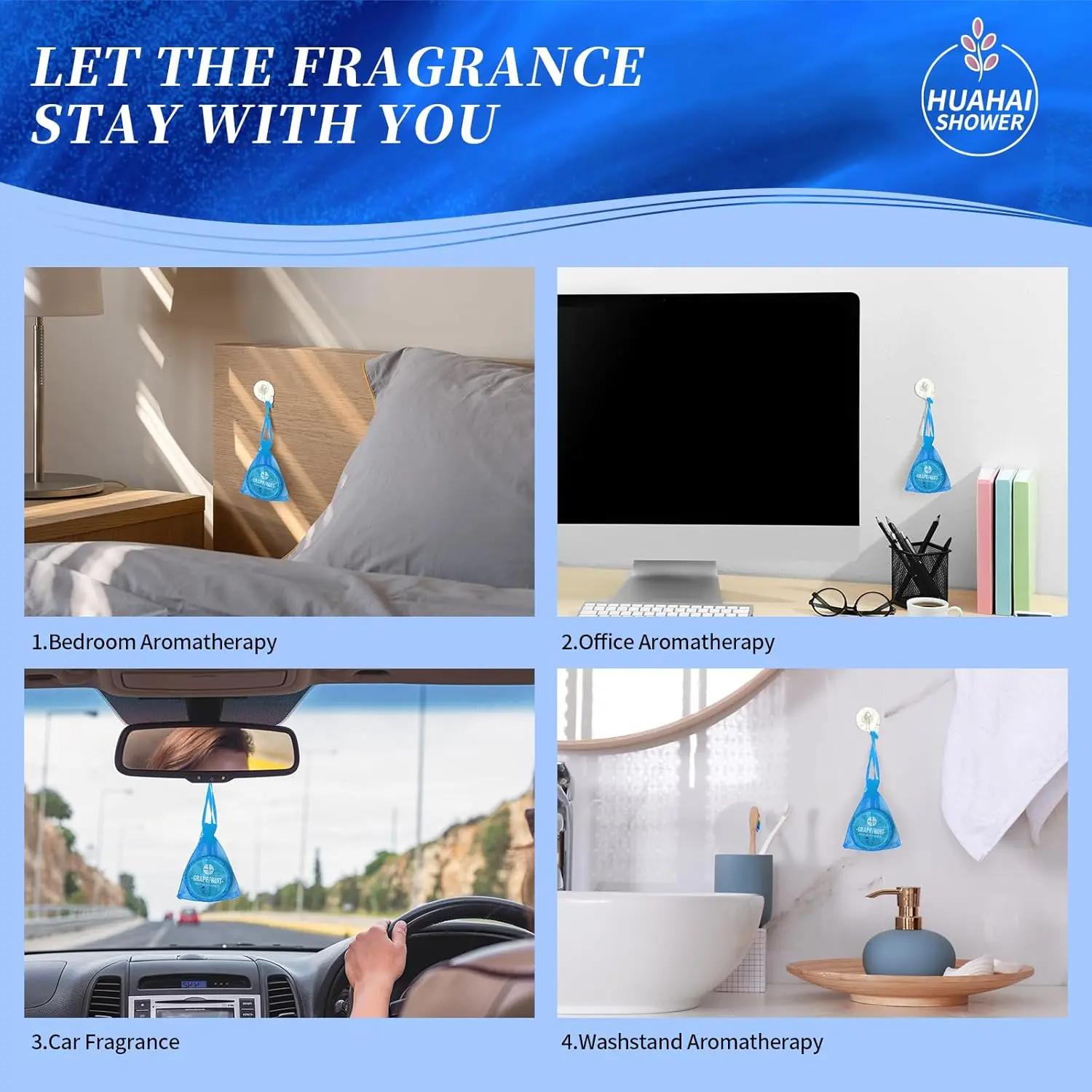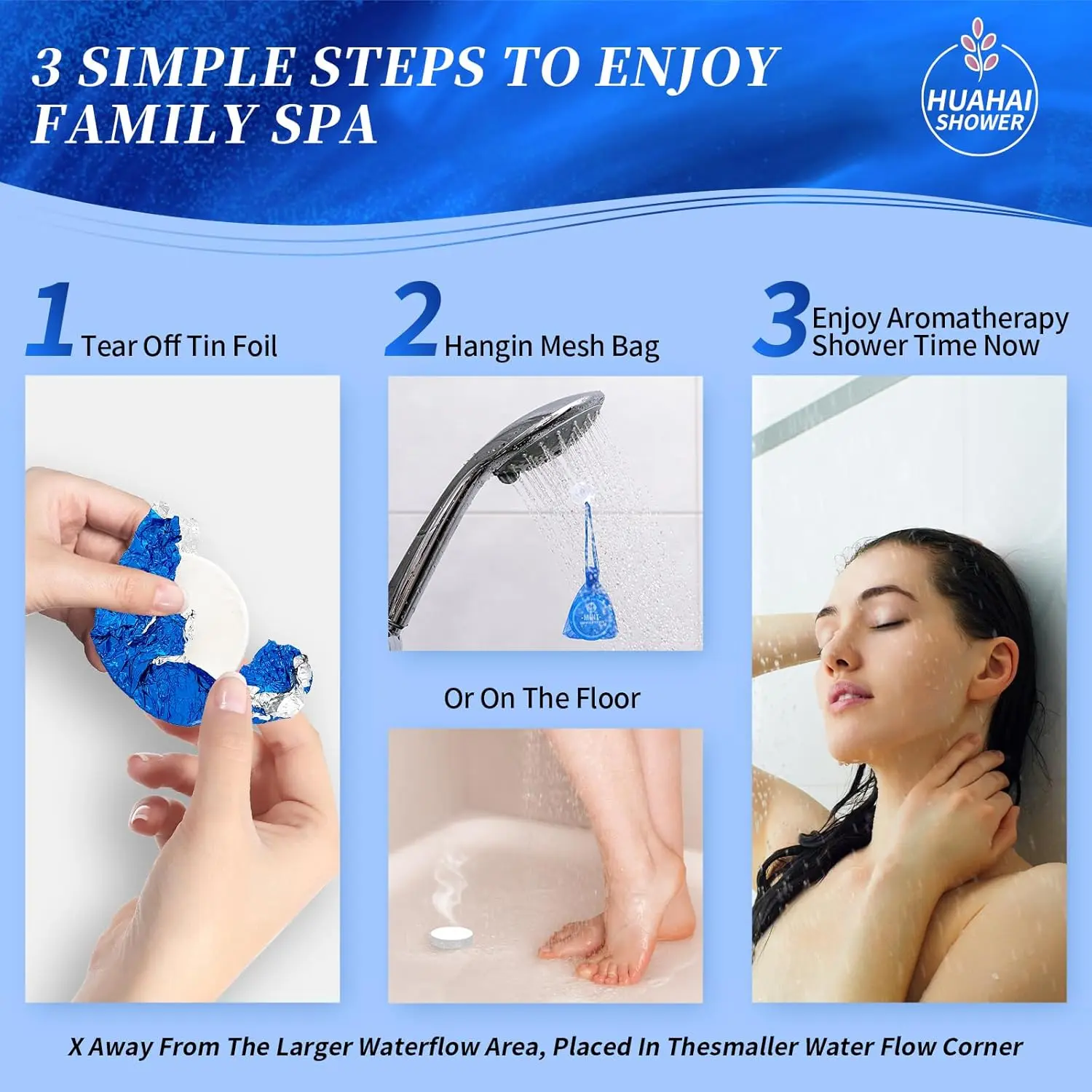 Experience the HUAHAI difference. Our shower steamers offer an upgraded usage method. While you can use the traditional method of placing the tablet in a small stream of water, we recommend hanging it using the provided hook mesh bag. Position the bag where it will be lightly drenched by water, allowing for a quicker and more potent release of the essential oil fragrances. For those who love a subtle scent throughout their day, our tablets can also be placed in your car, desk, bedside table, or washstand, providing a delicate fragrance even without water activation.