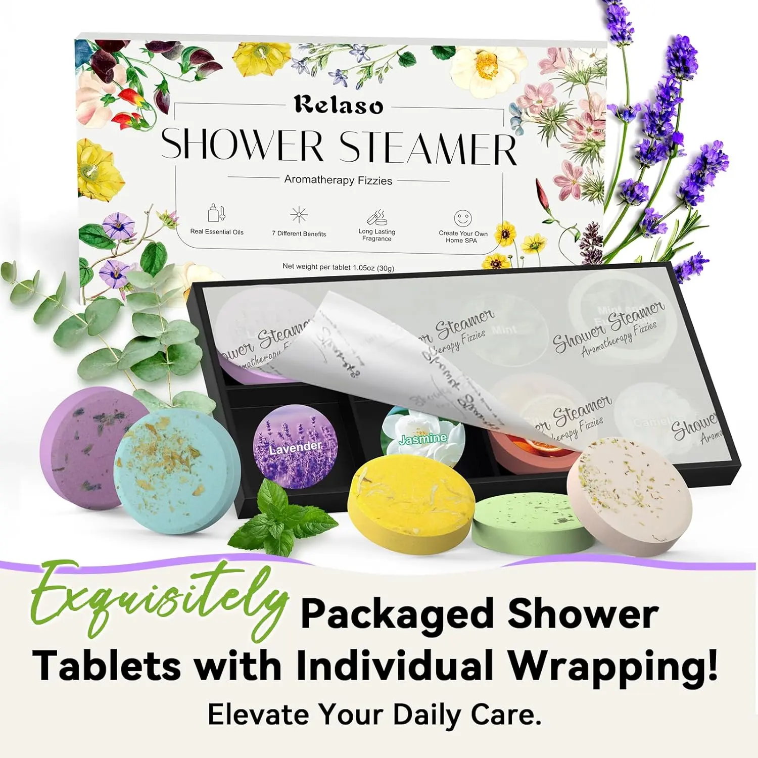 Indulge in spa-like aromatherapy at home with Relaso Shower Steamers! This gift set features 7 unique scents, crafted with natural ingredients to transform your shower into a relaxing retreat.