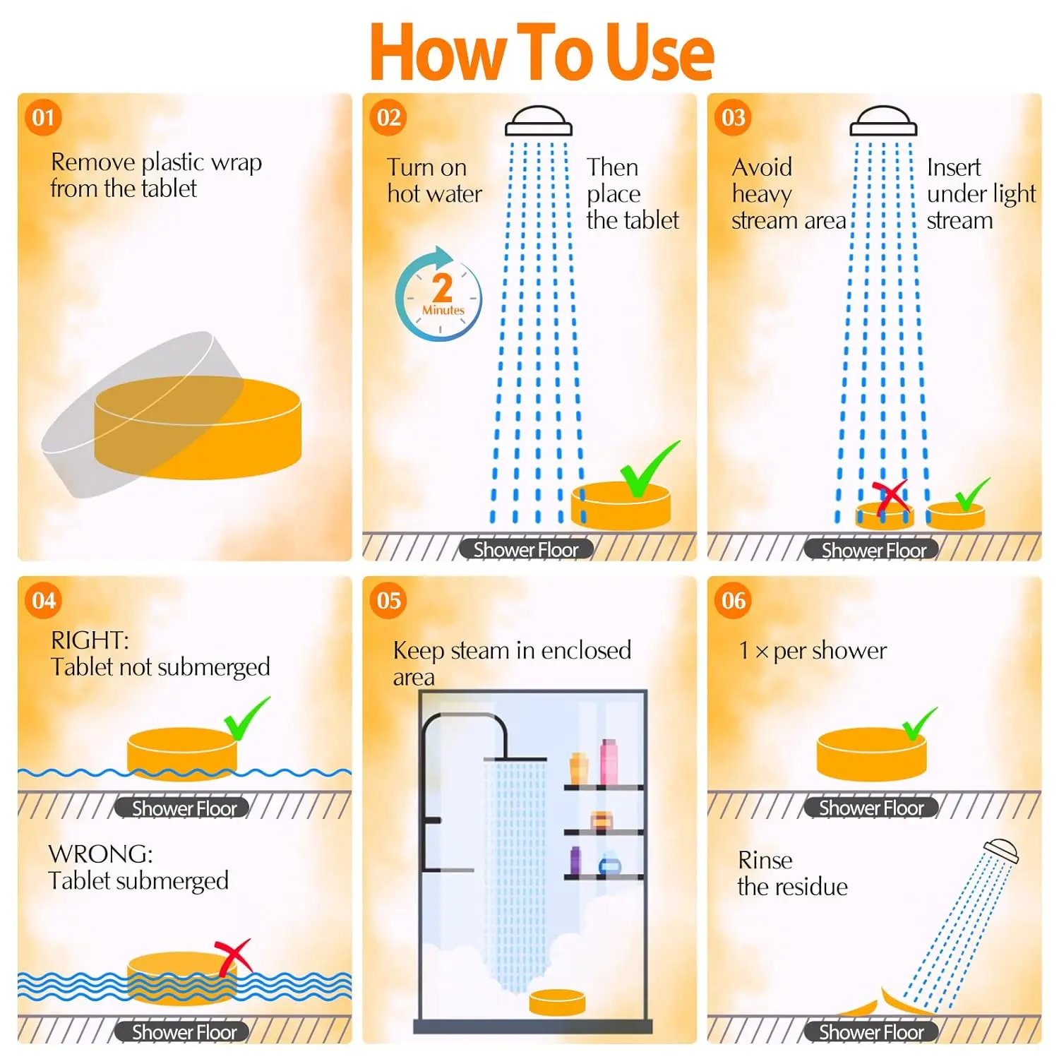 Transform your shower into a spa-like aromatherapy experience with our Shower Steamers Aromatherapy Set. Infused with pure essential oils and natural scents, these steamers offer a powerful and authentic aromatherapy experience right in your own bathroom. Each set includes six unique shower steamers designed to provide a variety of benefits: Lavender for promoting restful sleep, Rose for relaxation and stress relief, Eucalyptus for an invigorating and refreshing boost, Sweet Orange to support immune function, Peppermint for a cooling and invigorating sensation, and Jasmine for hair nourishment and relief. Experience a strong, natural scent that transforms your daily routine into a mindful moment of self-care. Perfect as a thoughtful gift for any occasion, our shower steamers are beautifully packaged and ready to give. Easy to use and environmentally conscious, simply place a steamer in the corner of your shower and let the captivating aroma fill the air. If you are seeking the ultimate self-care treat, our shower steamers are the best. Enjoy the benefits of essential oils and turn your everyday shower into a refreshing retreat.
