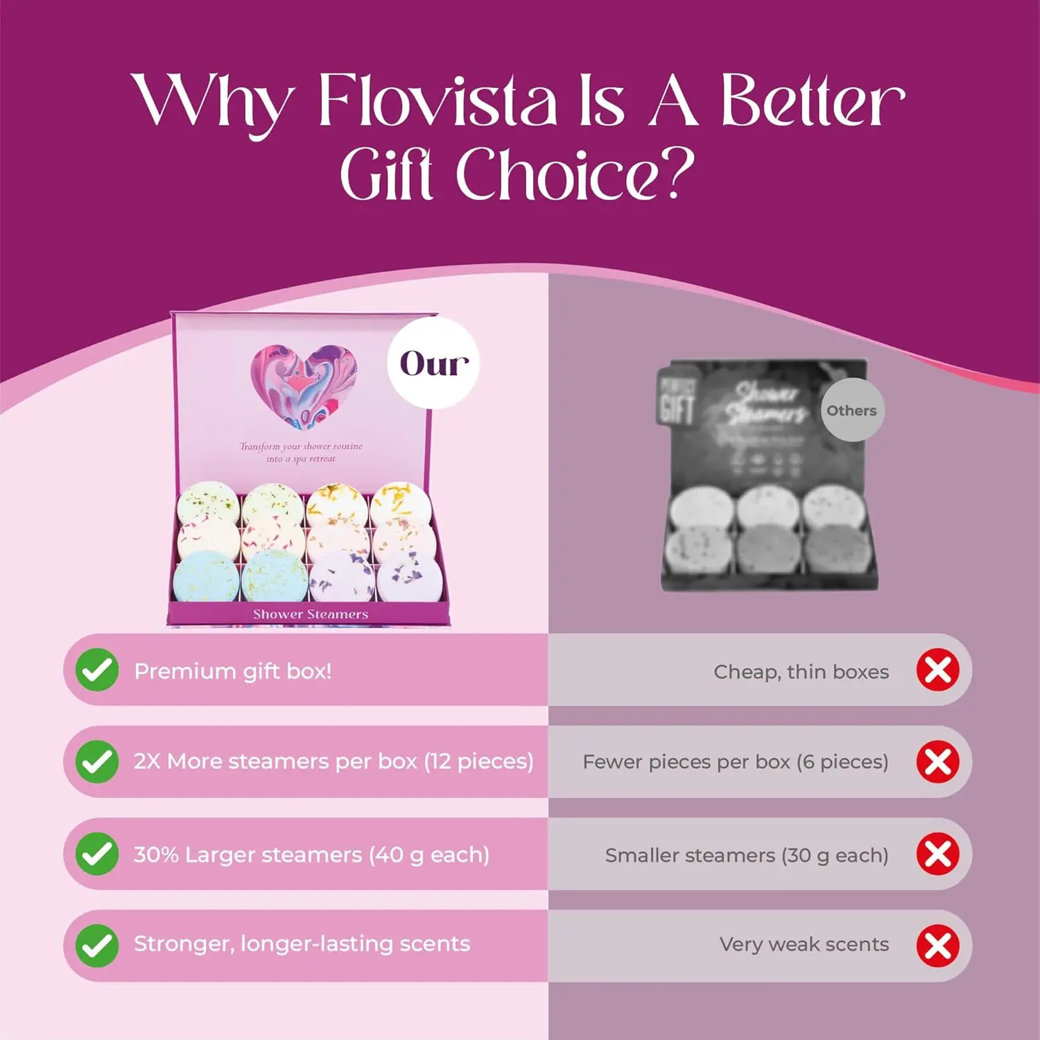 Flovista shower steamers make the perfect gift for any occasion. Whether it’s a birthday, Christmas, Mother’s Day, bridal shower, or simply a thoughtful gesture, these luxurious spa gifts are sure to be appreciated. The beautiful packaging eliminates the need for extra wrapping, making them a convenient and elegant present for the special women in your life, including your wife, mother, sister, or teen.
