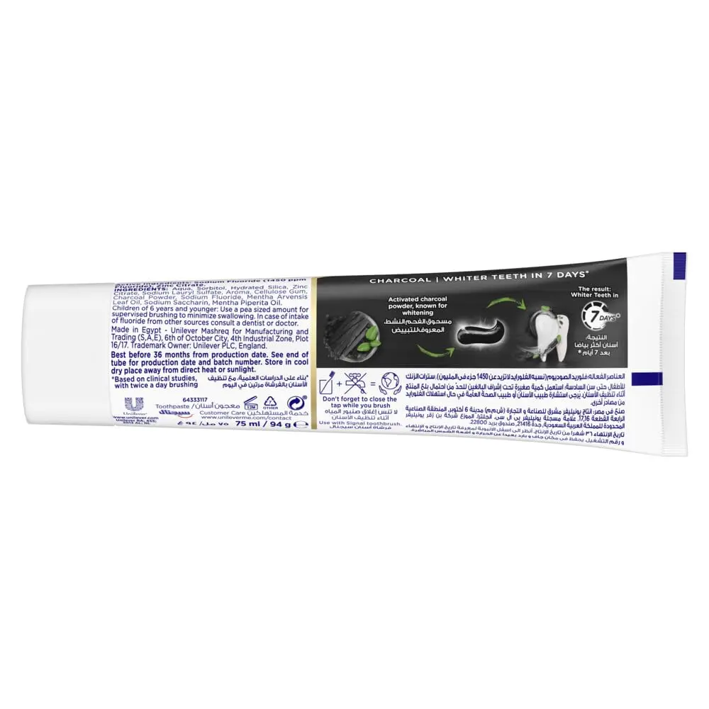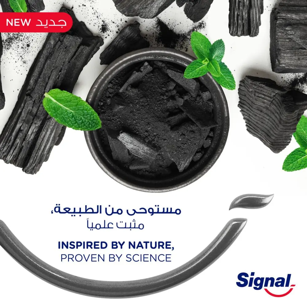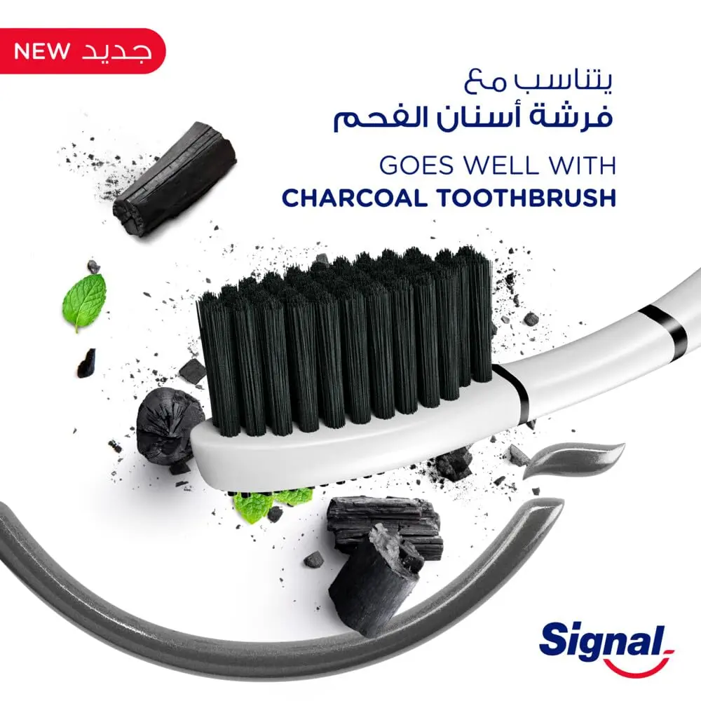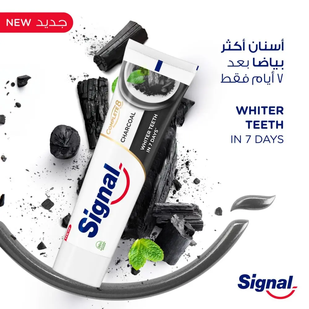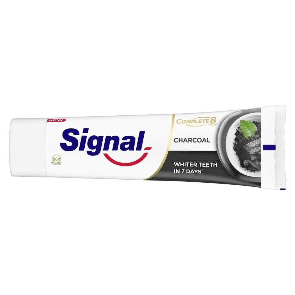 Experience the power of nature and science with Signal Complete 8 Nature Elements Charcoal Toothpaste. This effective antibacterial toothpaste boasts a formulation with 96% ingredients of natural origin, featuring Zinc Mineral, a potent antibacterial agent sourced directly from nature. Signal Complete 8 is clinically proven technology ensures you achieve both clean and visibly whiter teeth in just 7 days*. Enjoy comprehensive oral health benefits with every brush. Infused with 100% natural charcoal oil, this toothpaste delivers a refreshing taste that revitalizes your mouth. The antibacterial power of Zinc Mineral actively combats bacteria, addressing the root causes of gum problems and supporting optimal oral hygiene. The clinically proven formulation of Signal Complete 8 Nature Elements Charcoal toothpaste provides complete protection for your entire family, making it a versatile choice for all ages. Incorporate Signal Complete 8 Toothpaste into your daily oral hygiene routine by brushing thoroughly every morning and night. For enhanced protection, follow up with mouthwash. Remember to replace your toothbrush every 3 months to maintain optimal hygiene. Signal Complete 8 Nature Elements Charcoal Toothpaste is the perfect choice to make your teeth whiter and healthier.