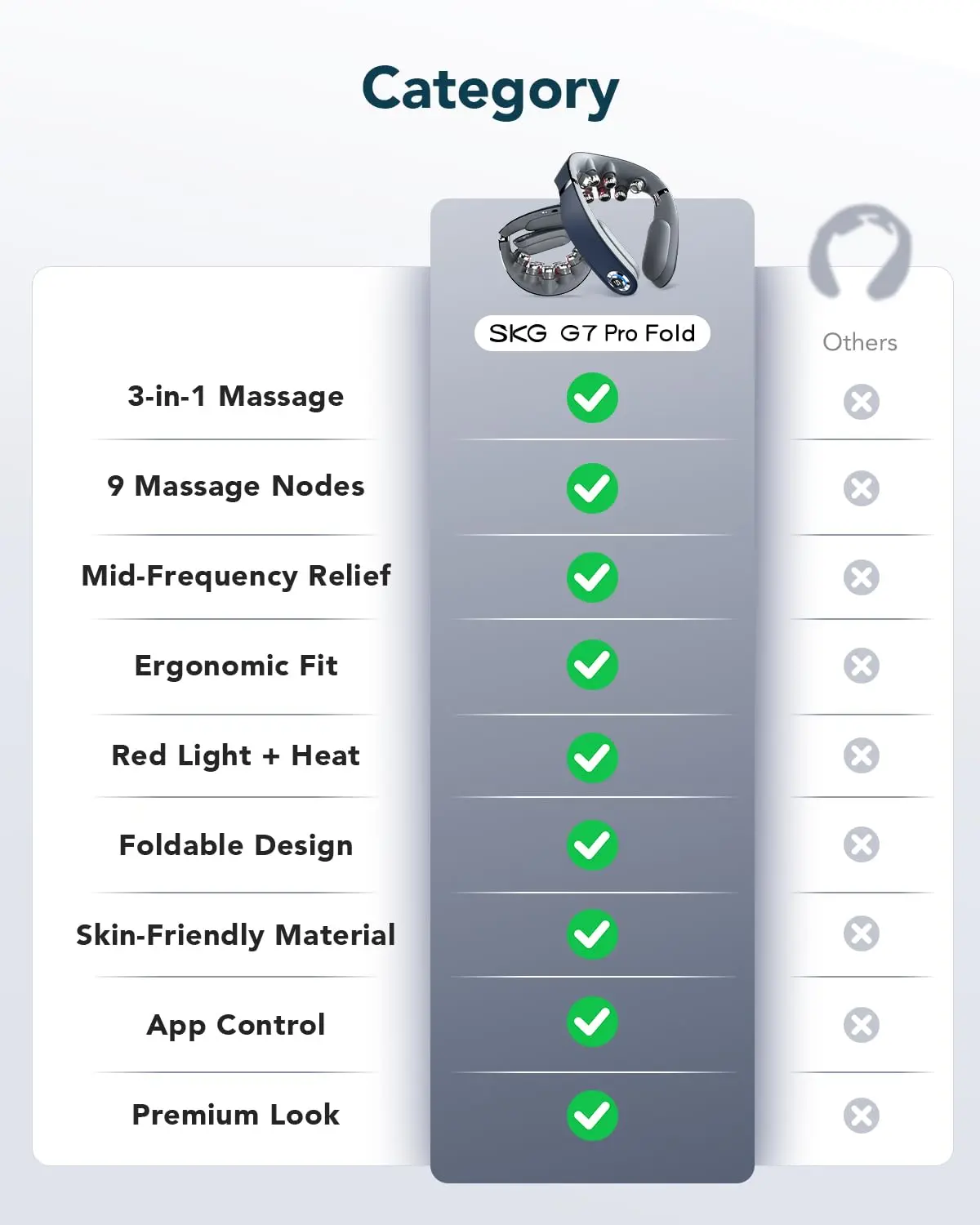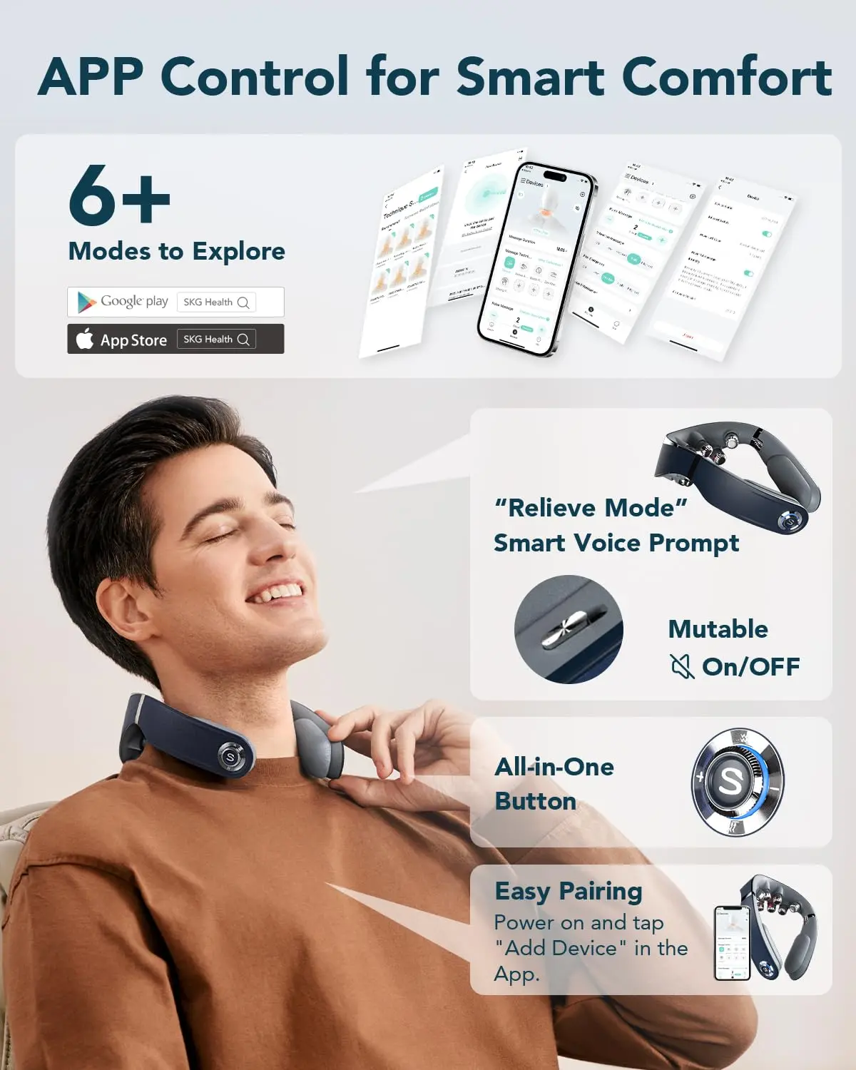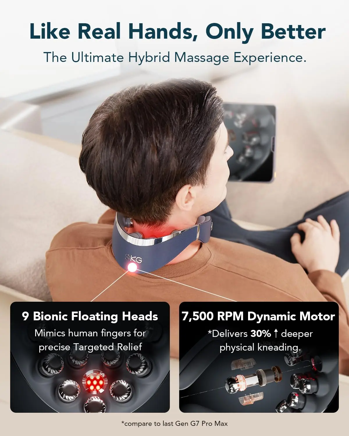 Experience unparalleled relaxation with the SKG G7pro-Fold Neck Massager. This innovative device combines unique vibrating red light massage with soothing heat to melt away tension and provide deep muscle relief. Unlike traditional percussion massagers, the G7 Pro utilizes advanced massage technology for a more effective and enjoyable experience. Featuring 9 upgraded vibrating massage heads, each providing a larger massage area and 30% higher vibration than previous generations, this massager delivers a truly immersive and revitalizing massage. Customize your experience with 5 different modes and 4 levels of heat and vibration to perfectly match your needs. Its foldable and lightweight design, weighing only 270g, makes it incredibly portable, allowing you to enjoy a relaxing massage anytime, anywhere. The long-lasting 2400mAh battery provides up to 140 minutes of continuous use, and the cordless design offers complete freedom of movement. The SKG G7 Pro is not just a massager; it’s a statement of quality and design, evidenced by its prestigious German IF Design Award 2024. The protein leather neck cushion ensures ultimate comfort, while the high-quality PU leather exudes sophistication. User-friendly multi-functional rocker buttons provide effortless control. Whether you’re seeking relief from neck pain, stress, or simply want to indulge in a moment of relaxation, the SKG G7 Pro Fold Neck Massager is the perfect solution. It also makes an exceptional gift for family and friends. Enhance your massage experience by lightly wiping the massage heads with a wet wipe before use for a smoother, more comfortable feel. For enhanced control, download the dedicated app – scan the QR code on Android or search for “Future Wear” on iOS. Discover the difference and elevate your well-being with the SKG G7 Pro.