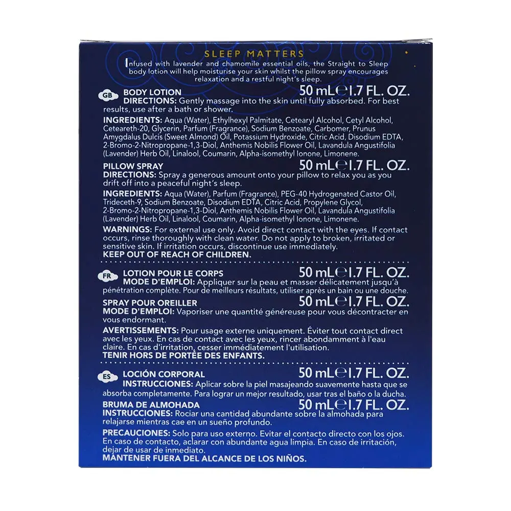 Drift off to dreamland with our Sleep Gift Set, the perfect remedy for a restless night. This thoughtfully curated set is designed to promote relaxation and enhance your sleep quality. The star of the set is our Straight to Sleep Body Lotion, a luxurious and deeply moisturizing formula that will leave your skin feeling soft and supple. Infused with a soothing blend of chamomile and lavender essential oils, renowned for their calming and sleep-inducing properties, this lotion creates a tranquil atmosphere, preparing your mind and body for a peaceful slumber. In consumer trials, 83% of participants reported falling asleep faster after using this product.