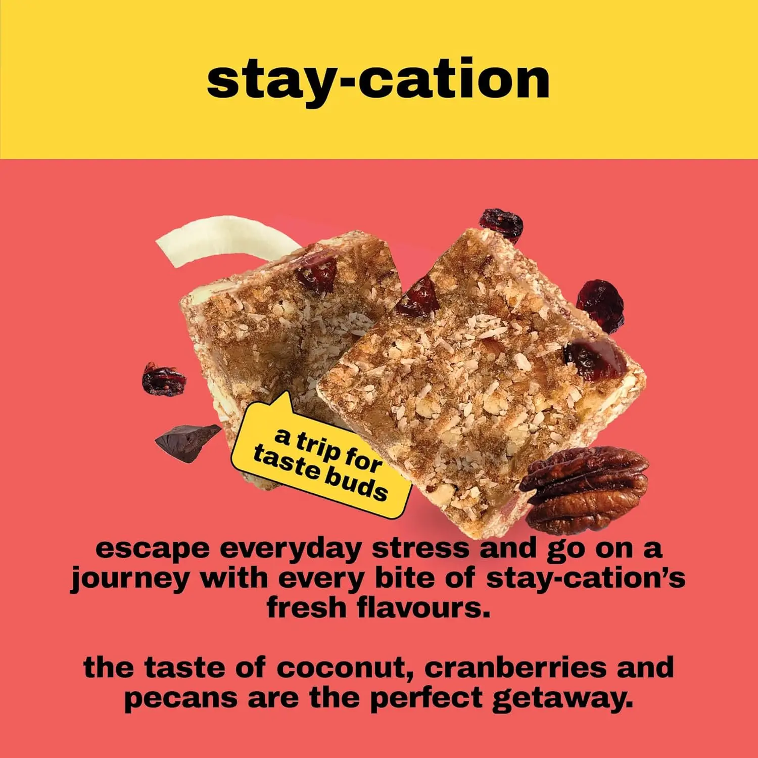 Escape the everyday with Snack Studio Stay-Cation, the plant-based snack bar crafted for a guilt-free getaway. Indulge in the wholesome goodness of clean, natural ingredients, meticulously combined in small batches by our dedicated chefs. Each bar is a journey of flavor, designed with a BASE of coconut bits, homemade chocolate, and dates, a satisfying BITE of pecans, and a vibrant KICK of dried cranberries. Stay-Cation is more than just a snack; it’s an experience. The taste of coconut, cranberries, and pecans create the perfect stay-at-home escape. We believe in simple, honest ingredients, which is why our bars contain no added sugar, no preservatives, no added flavoring, and no added coloring. Support local and treat yourself to a delicious and healthy snack developed and made right here in the UAE. Enjoy the perfect blend of taste and nutrition with every bite of Snack Studio Stay-Cation. These snack bars provide a healthy source of energy, perfect for a mid-day boost or a post-workout refuel. The combination of textures and flavors is designed to satisfy your cravings while providing essential nutrients. Treat yourself to a moment of bliss with Stay-Cation and experience the difference that quality ingredients and thoughtful craftsmanship can make. Discover the perfect guilt-free indulgence that supports local and nourishes your body.