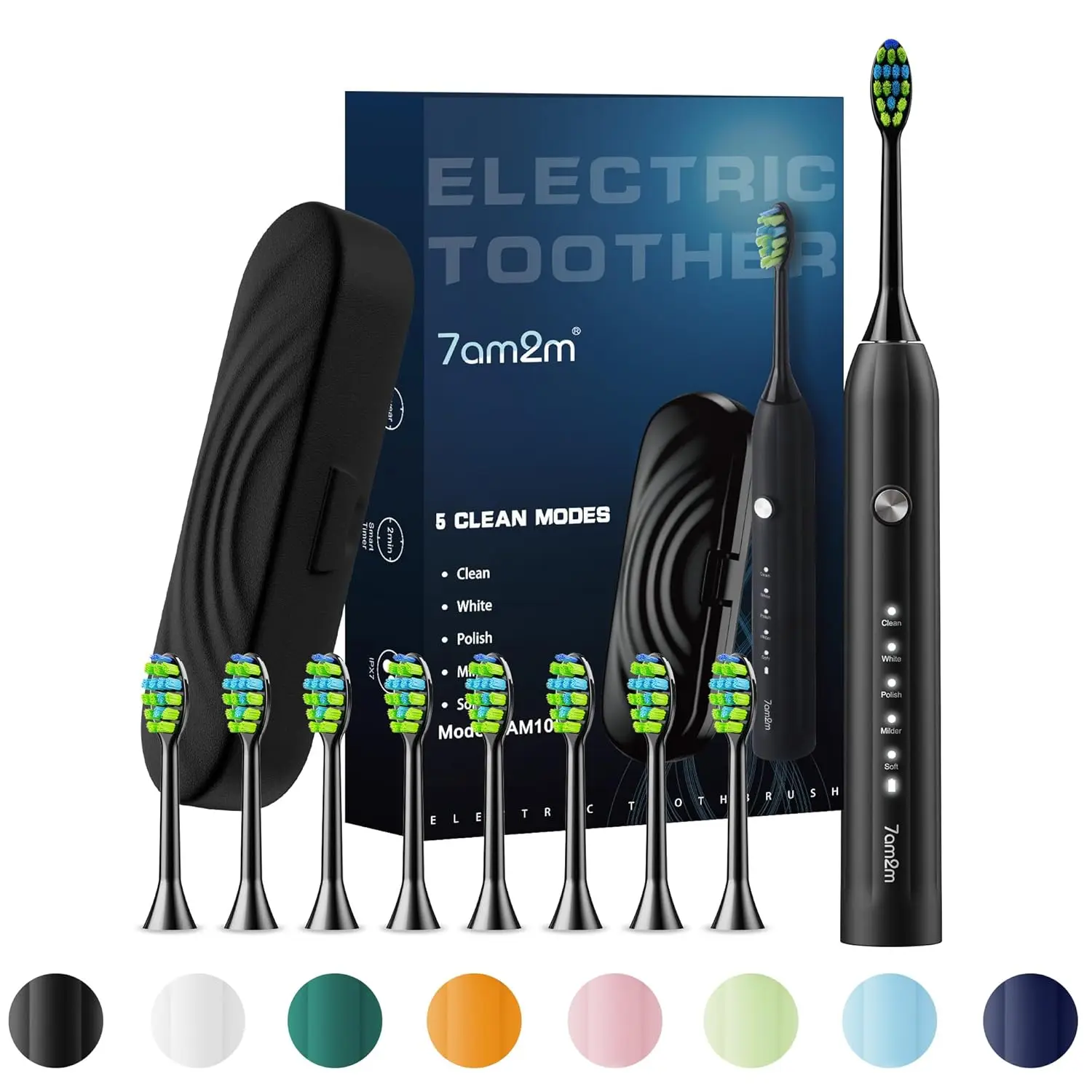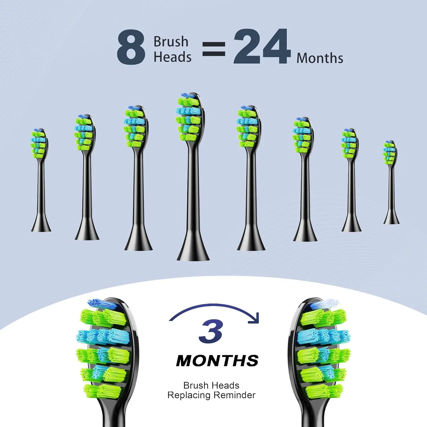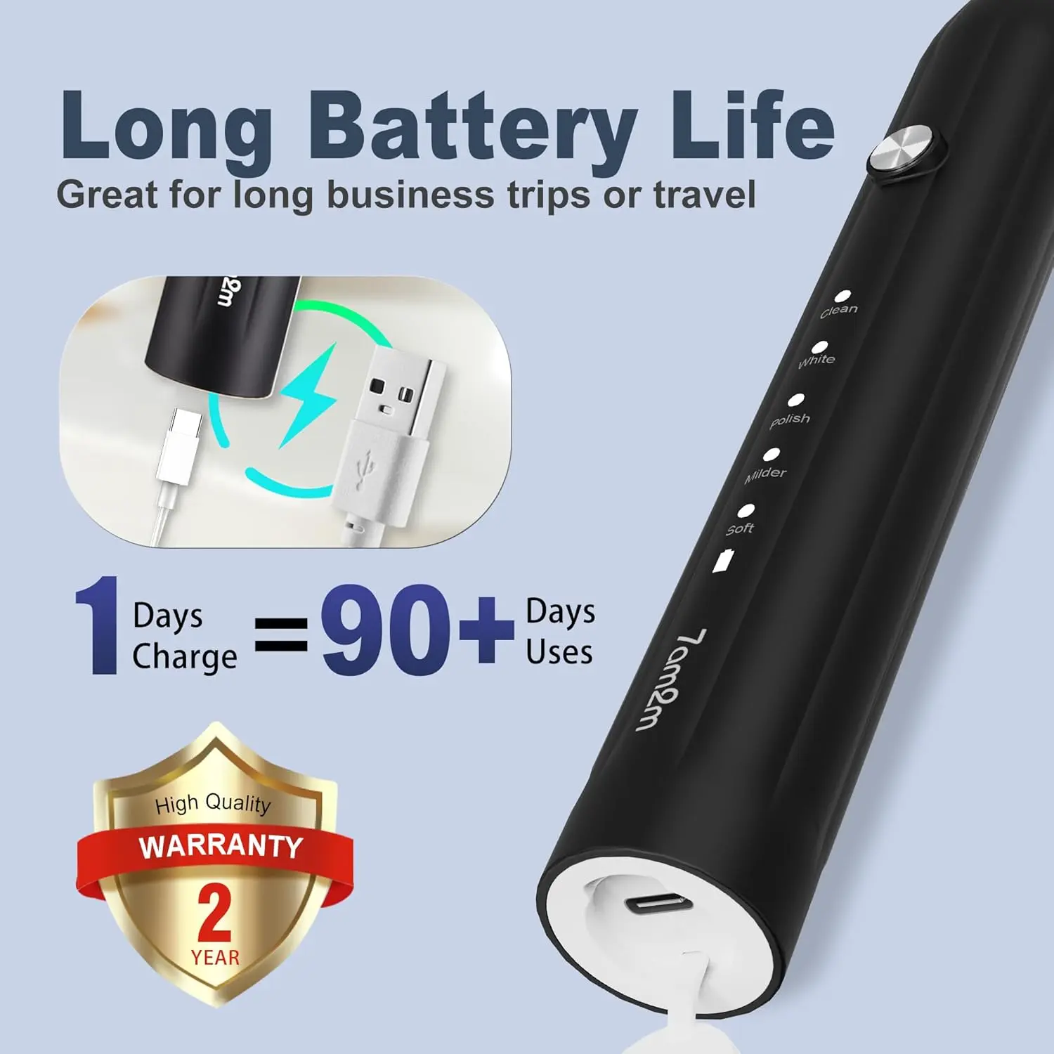 Experience a superior clean with our Sonic Electric Toothbrush. Featuring advanced sonic technology, this toothbrush delivers powerful yet gentle vibrations to remove up to 100% more plaque than a manual toothbrush. Achieve a brighter, healthier smile in just two weeks! This toothbrush boasts an impressive 90-day battery life on a single charge, making it perfect for travel and everyday use. With 5 distinct brushing modes – Clean, White, Polish, Milder, and Soft – you can customize your brushing experience to suit your specific needs and preferences. Whether you have sensitive gums or are looking to whiten your teeth, this toothbrush has you covered. The included 8 DuPont brush heads ensure long-lasting use for over two years. Each “W” shaped brush head is expertly designed to reach every corner of your mouth for a thorough clean. The built-in smart timer pauses every 30 seconds, prompting you to switch quadrants, while the 2-minute timer ensures dentist-recommended brushing time. Develop healthy brushing habits and improve your overall oral health with this exceptional electric toothbrush. We are confident in the quality of our product, offering a 2-year assurance for your peace of mind. If you encounter any issues, please contact us through your Amazon account for prompt and satisfactory customer service. Invest in your oral health today and experience the difference a sonic electric toothbrush can make. The multiple modes help provide the best possible cleaning depending on the day or users needs, and the long lasting heads and battery make this brush the best value on the market.
