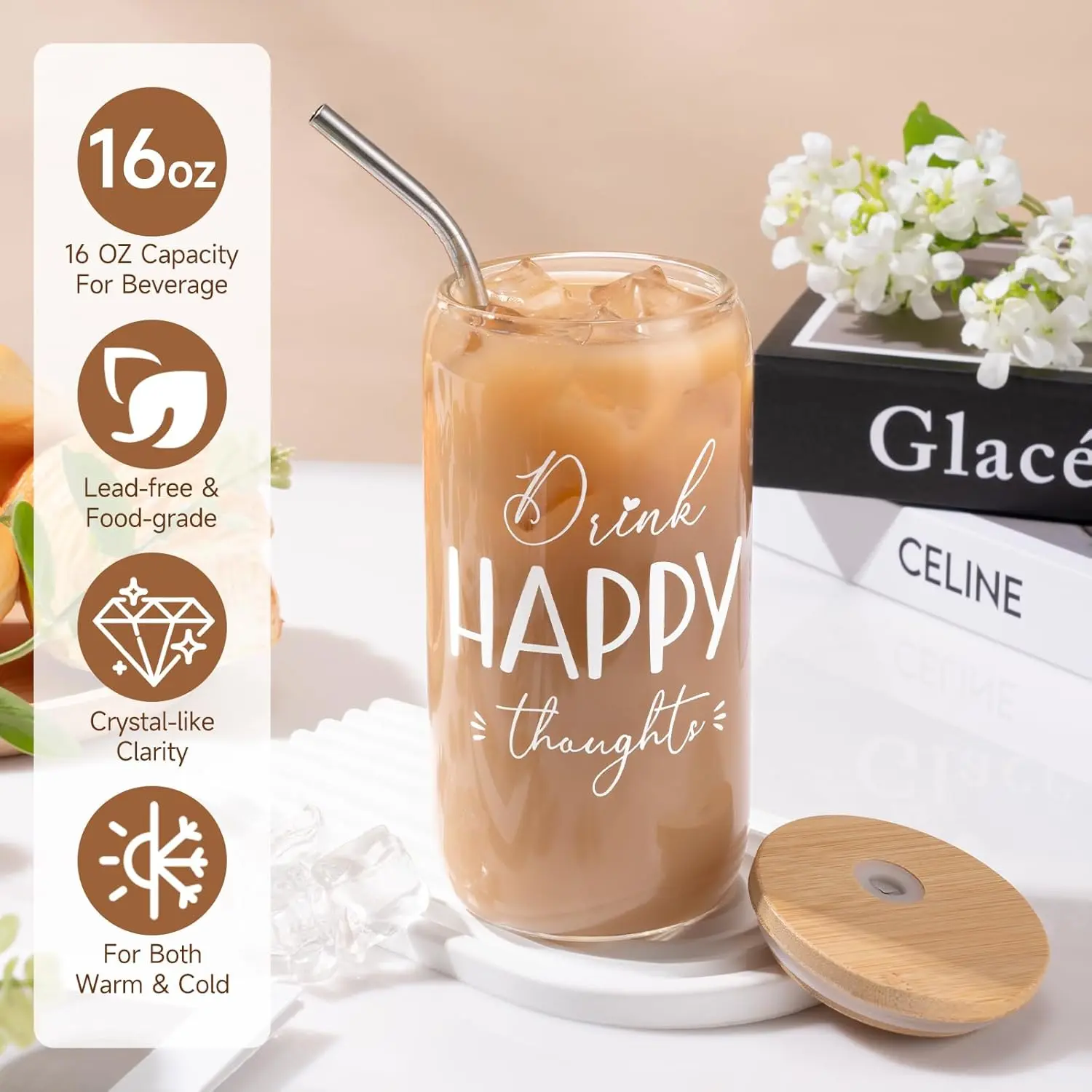 • Includes 16oz Glass Cup with “Drink Happy Thoughts” quote