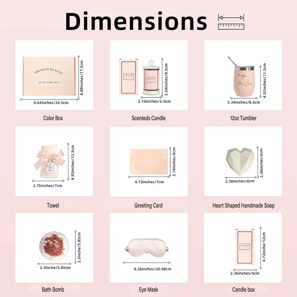 Indulge in the ultimate relaxation experience with our luxurious Spa Gift Set, designed to transform your bath into a serene sanctuary. This thoughtfully curated set includes everything you need to unwind, de-stress, and pamper your skin. The centerpiece is a collection of fizzy bath bombs, formulated with natural organic essential oils to nourish and moisturize your skin, leaving it feeling soft, supple, and radiant. Watch as the bath bomb dissolves in warm water, releasing vibrant colors and a delightful fragrance, creating a captivating visual and aromatic experience. The set also features a hand-poured scented candle made with 100% vegan-friendly soy wax, infusing your bathroom with a calming and inviting ambiance. Light the candle, dim the lights, and let the soothing scent melt away your stress. To complete the spa experience, we’ve included a soft and absorbent bath towel, a luxurious blindfold for ultimate relaxation, an elegant cup for your favorite beverage, and a heartfelt card to express your sentiments. This Spa Gift Set is the perfect way to treat yourself or a loved one to a well-deserved escape from the everyday hustle and bustle. It’s an ideal gift for birthdays, holidays, anniversaries, or any occasion where you want to show someone you care. All substances in the bath bombs are entirely water soluble, ensuring no stains remain on your tub or body after use. Enjoy a truly rejuvenating and unforgettable spa experience in the comfort of your own home. Transform your bathroom into your personal oasis with our Spa Gift Set.