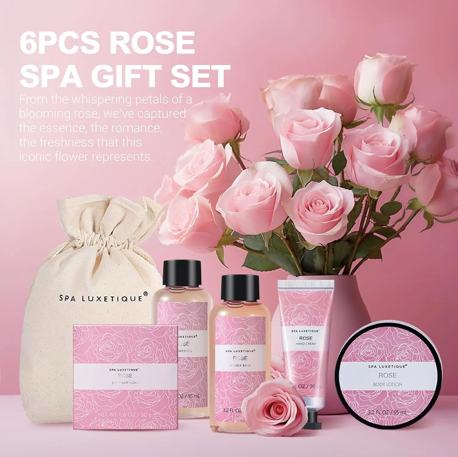 Indulge in a luxurious spa experience with our Rose Travel Spa Kit! This exquisite Spa Gift Set for Women is the perfect way to pamper yourself or show a loved one how much you care. Formulated with nourishing organic ingredients and essential oils, including enriching coconut & shea butter, soothing aloe, and revitalizing vitamin E, our mini skin cleansing and moisturizing products provide all the benefits you need for radiant, healthy skin on the go. Whether you’re heading to the gym or embarking on a travel adventure, our self-care set is designed for convenience and daily use. The Rose Spa Kit is specifically created to moisturize and soften dry skin, leaving you feeling refreshed and rejuvenated. This perfect spa gift set is a thoughtful present of relaxation, helping your loved ones look their best and bloom with beauty. Our spa kits are sure to make that special lady in your life feel cherished and loved. Packaged in a natural burlap gift bag with a secure jute drawstring, our “On-the-Go” size is reusable, convenient, and lightweight, making it easy to carry for any travel occasion. The beautiful spa box contains premium products wrapped with care, making it an ideal gift for Christmas, Birthdays, Holidays, Anniversaries, Mother’s Day, and Valentine’s Day. Experience the delightful fresh fragrance that accompanies our self-care gifts, enhancing your overall well-being. This is more than just a gift; it’s an invitation to indulge in a little self-love and care. Give the gift of beauty and relaxation today!