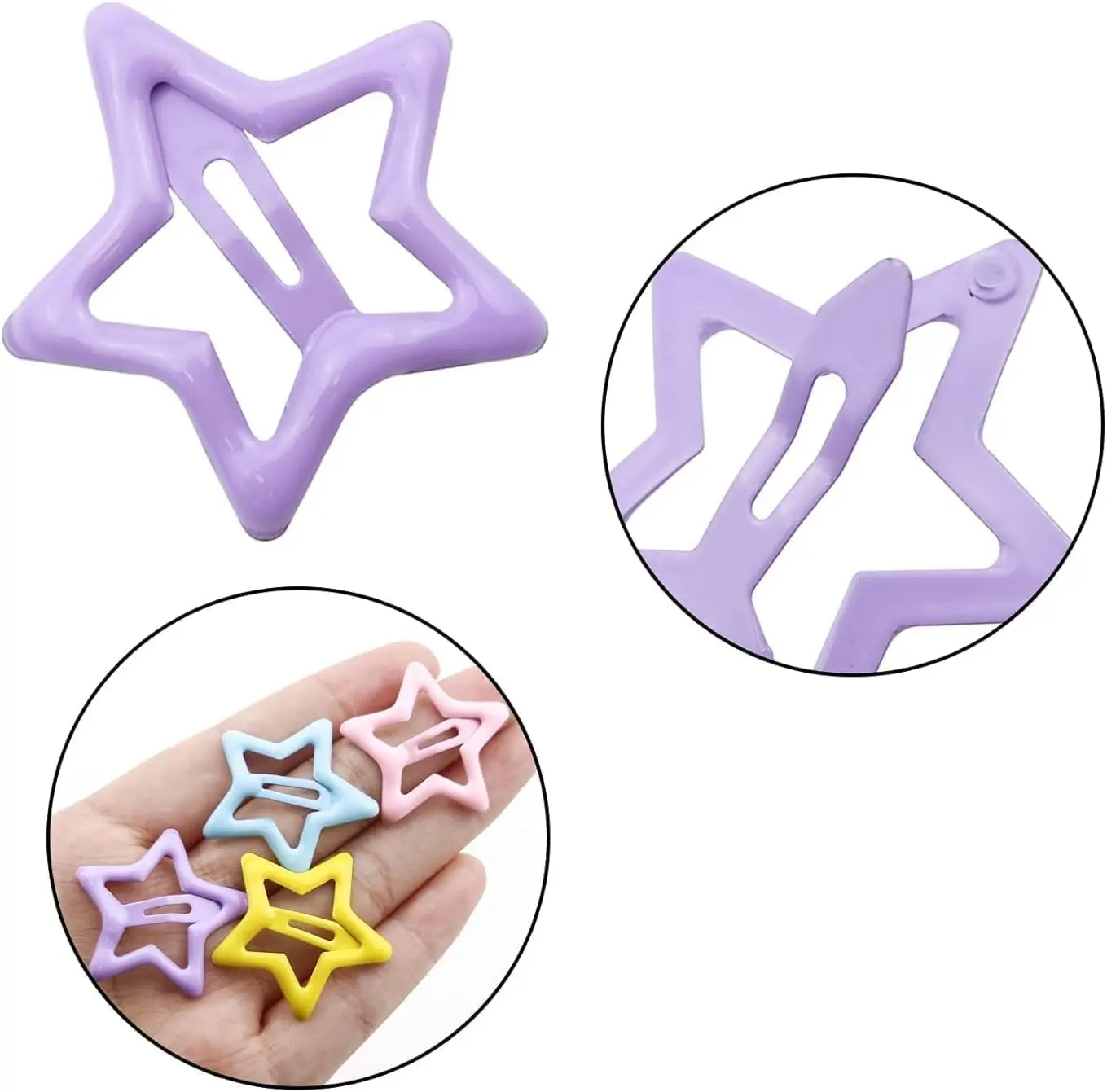 Get 30 colorful star hair pins! Made of high-quality metal, these snap barrettes are perfect for parties, school, or as a gift. Secure grip, no hair damage.