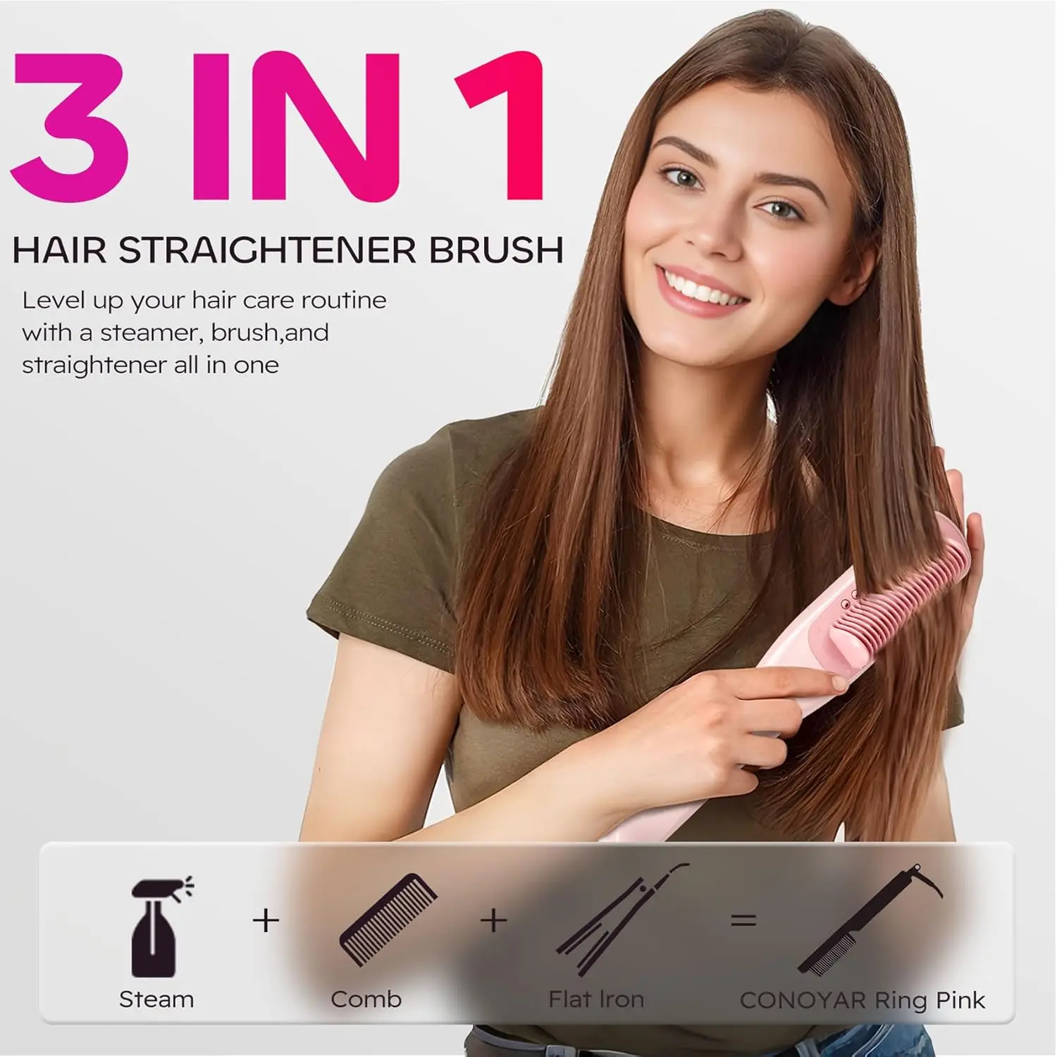 Achieve salon-worthy hair at home! This 3-in-1 Steam Hair Straightener Brush delivers smooth, shiny, frizz-free results with hydrating steam, fast heating, and anti-scald protection. Safe and easy to use!