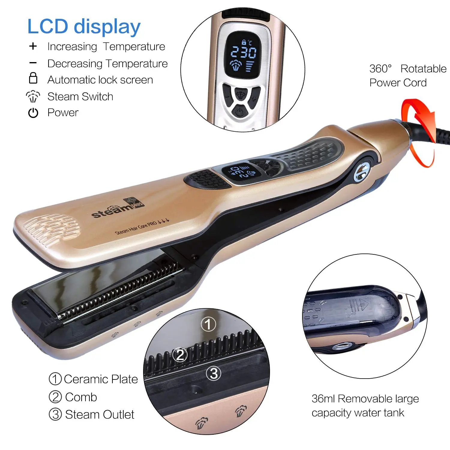 Unlock salon-quality results from the comfort of your own home with our innovative Steam Hair Straightener Flat Iron. This professional-grade straightener combines the power of steam hydration with advanced heating technology to transform frizzy, dull hair into sleek, healthy-looking locks. The secret lies in the 7pcs steam holes, which deliver a consistent 4.5g/min steam eruption. This allows water ions to deeply penetrate the hair shaft, from root to tip, locking in up to 90% of the hair’s moisture and adding 50% more hydration. Experience the difference of true hydration – say goodbye to the dry, burnt look of traditional straighteners and hello to silky-smooth, naturally healthy hair. The integrated 3D combs gently guide hair, preventing snags and tears, ensuring a seamless straightening experience. The titanium-plated aluminum plates seal the hair cuticles, reducing split ends and knotting, leaving your hair with a smooth, lustrous shine. Safety is paramount with our auto-off function, which activates after 60 minutes of inactivity, and the auto temperature lock, which maintains your desired heat setting for consistent results. The new MCH (Metal Ceramic Heater) technology provides rapid and even heat distribution, with adjustable temperatures ranging from 150°C (300°F) to 230°C (450°F) to suit all hair types, from fine and delicate to thick and coarse. Reaching your desired temperature in just one minute, this straightener offers exceptional performance and efficiency. The simple and intuitive design allows for effortless straightening at any angle, thanks to the 360-degree swivel power cord. The LCD display screen and easily removable 40ML water tank further simplify the straightening process, making it a breeze to achieve salon-worthy results at home.