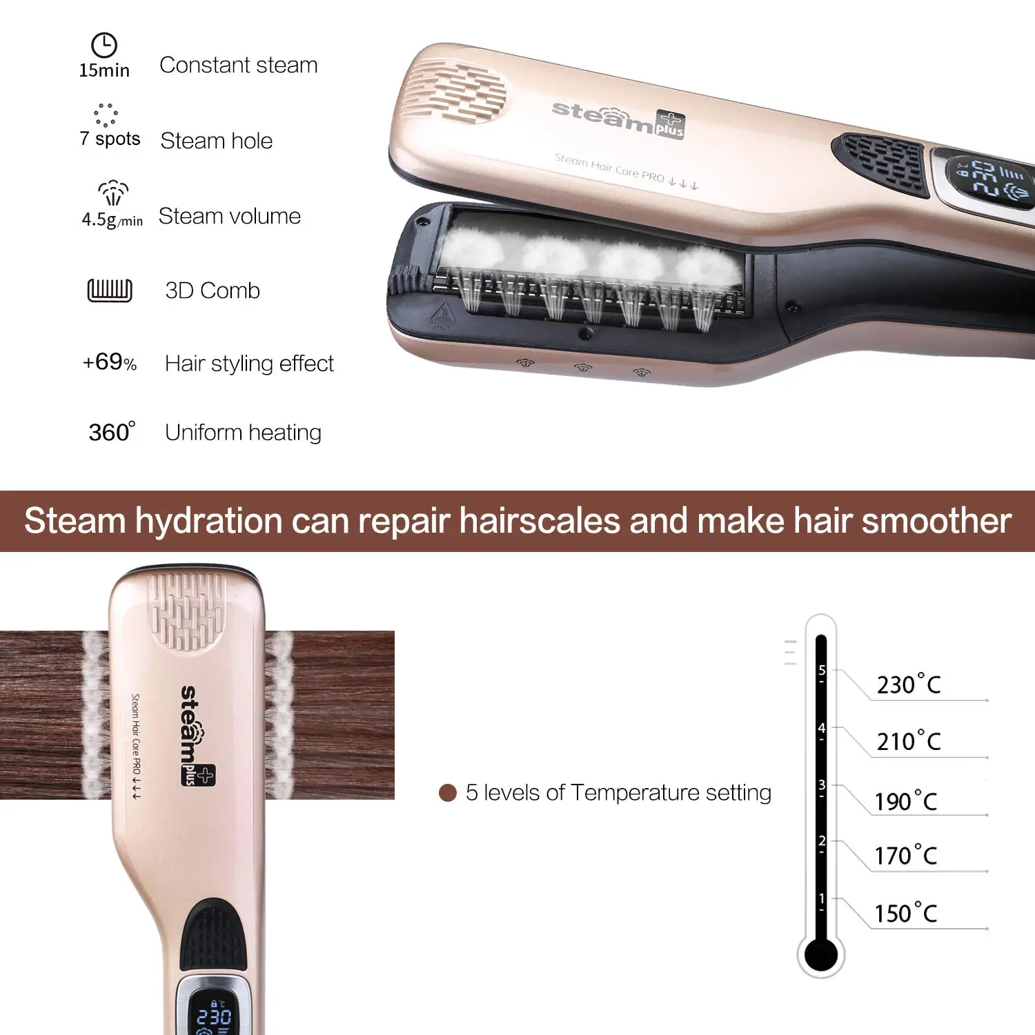 • 3D combs: Prevent hair tearing for better straightening.