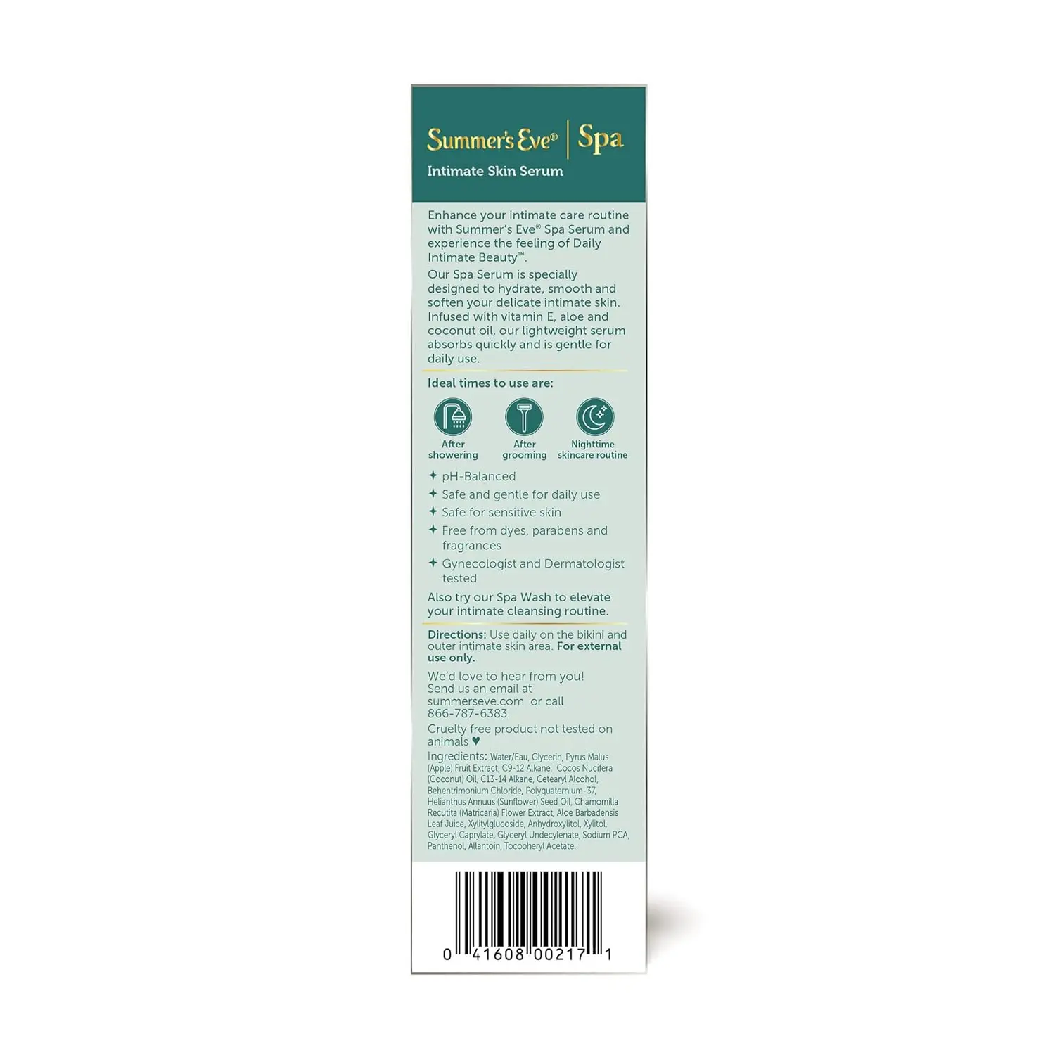 Indulge your intimate skin with Summer’s Eve Spa Intimate Skin Serum. This lightweight serum is designed for everyday use and absorbs quickly, leaving your skin feeling refreshed and revitalized. It’s the perfect addition to your daily routine, whether you’re applying it after showering, after shaving or waxing, or as part of your nighttime skincare regimen. Clinically tested and pH-balanced, this fragrance-free serum is infused with vitamin E, coconut oil, and aloe to comfortably hydrate, smooth, and soften delicate intimate skin. Gynecologist tested and safe for sensitive skin, this serum provides the gentle care you deserve. Join the 9 out of 10 women who say the serum soothed skin after shaving. Experience the difference with Summer’s Eve Spa Daily Intimate Skin Serum. Each tube contains 1 oz of this skin-loving formula.