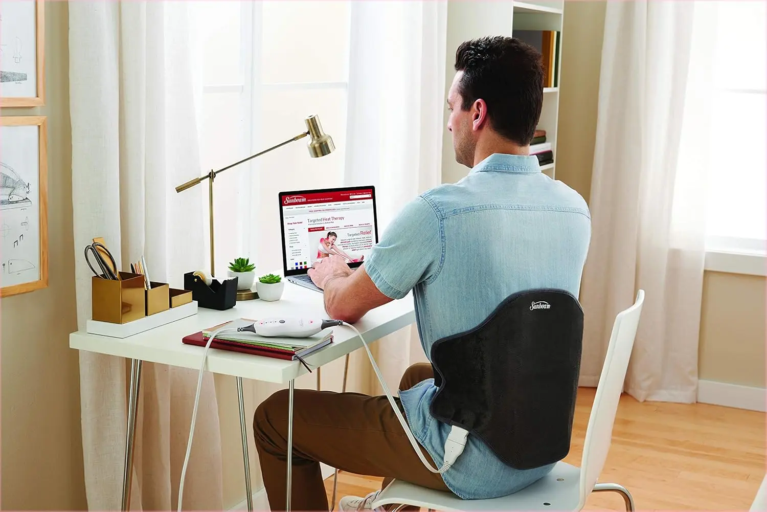 Experience targeted and soothing pain relief with the Sunbeam Back Heating Pad Wrap. Designed specifically for back pain, this 23 x 15-inch heating pad contours to the shape of your back, delivering high-level heat precisely where you need it most. Effectively alleviate common muscle pain, tension, and stress with the clinically proven power of heat. This wrap increases blood flow, accelerating tissue healing and relaxing sore muscles. Enjoy hands-free convenience with the adjustable waist strap, which securely fits up to an 85-inch waist. The easy-to-use push-button controller allows you to customize your treatment with 4 heat settings, easily visible in the dark thanks to the LED heat-setting lights. Additional convenient features include a 2-hour auto-shutoff for safety and a long, 9-foot cord for flexible use. For deep, penetrating pain relief, utilize the moist heat option by lightly spraying the fabric with water. Maintenance is a breeze with the fully machine washable and dryer-safe luxurious Micromink wrap—simply disconnect the controller before washing. This heating pad is UL Certified and FDA registered as a Class II Medical Device and is HSA/FSA eligible. Say goodbye to back pain and hello to comfort and relief.