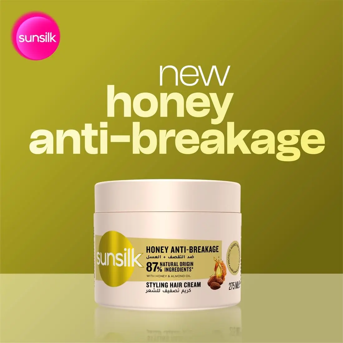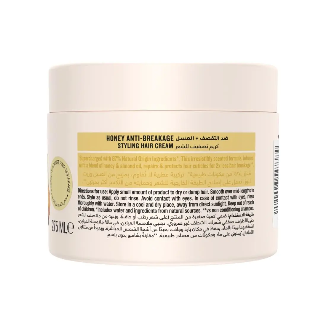 Discover the revitalizing power of the NEW Sunsilk Honey Anti-Breakage Styling Cream! Experience a fresh new look and a supercharged formula infused with 87% natural origin ingredients*. This irresistibly scented cream, blended with honey and almond oil, not only smells divine but also works wonders to repair and protect your precious hair cuticles. Say goodbye to frustrating breakage and hello to stronger, healthier-looking hair. Our unique formula helps to mend existing damage while providing a protective shield against future breakage. This styling cream is designed to give you 2X less hair breakage**, allowing you to style with confidence, knowing your hair is fortified and protected. Whether you have dry, damaged, or simply breakage-prone hair, Sunsilk Honey Anti-Breakage Styling Cream is your go-to solution. Easy to use on both damp or dry hair, simply apply a small amount from mid-lengths to ends, style as desired, and leave in for continuous protection. For the ultimate hair care routine, explore the complete Sunsilk Honey Anti-Breakage range and combine this styling cream with our Honey Anti-Breakage shampoo and conditioner. Unlock the secret to resilient, beautiful hair with Sunsilk. Enjoy the confidence of knowing you are using a product that not only cares for your hair but also is mindful of its ingredients, containing a high percentage of natural origin components*. Make Sunsilk Honey Anti-Breakage Styling Cream a staple in your hair care regime and witness the transformation to stronger, healthier, and more manageable hair. This luxurious cream not only protects your hair, it helps repair the damage too.