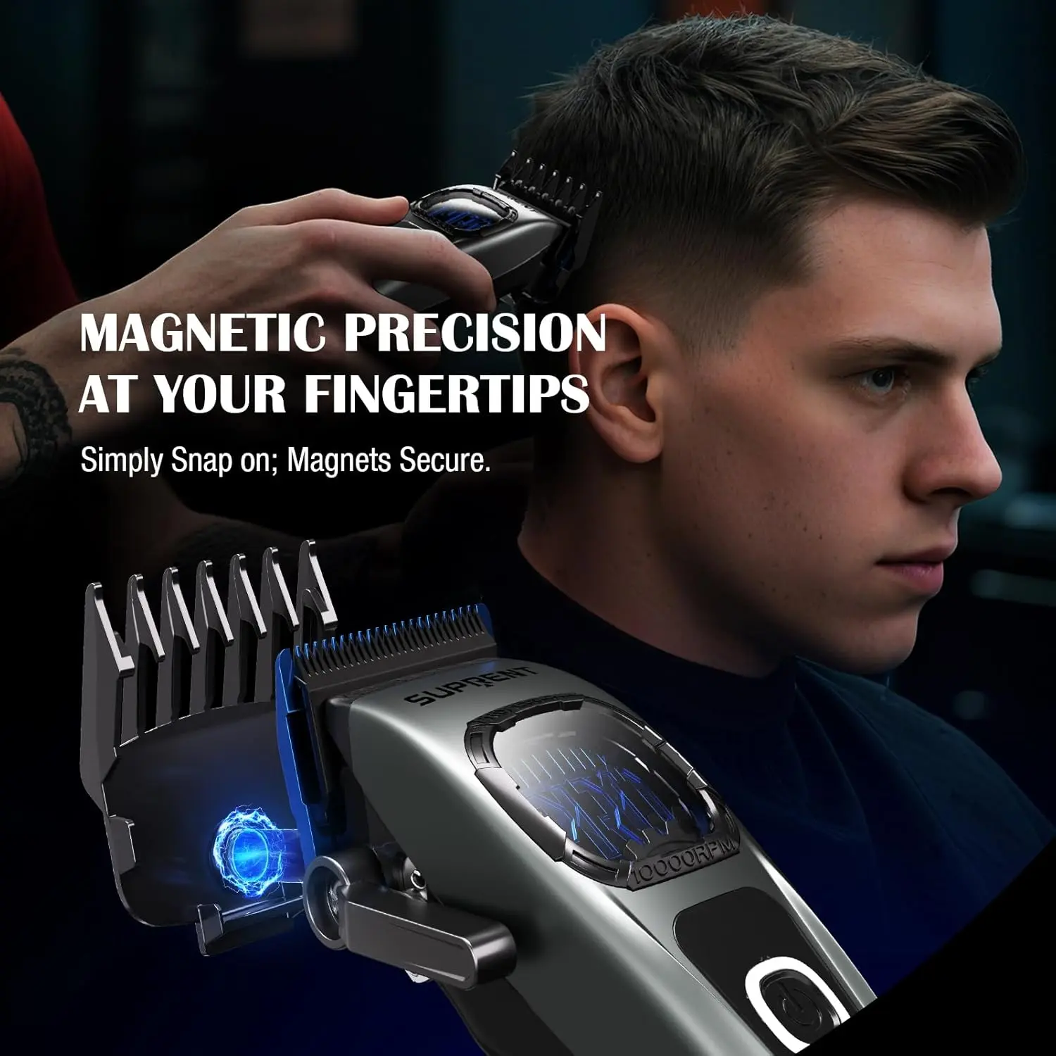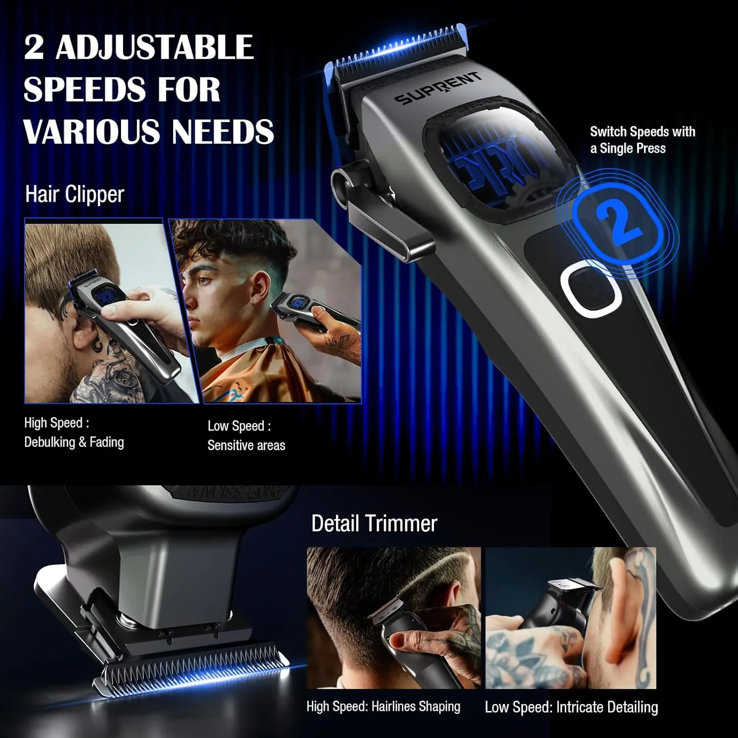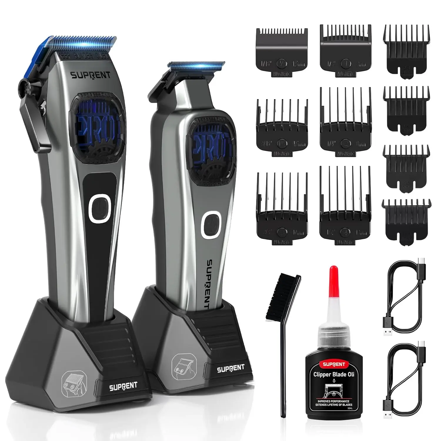 Experience pro-level power and precision with the SUPRENT Hair Clipper and Trimmer Set! This barber-tested combo boasts a robust 10,000 RPM motor with enhanced 5V technology, delivering 35% more power than standard clippers for smooth, consistent cutting, even on thick and coarse hair. The blue titanium-coated precision blades feature a built-in oil system for automatic lubrication and long-lasting sharpness. Enjoy seamless fades and incredibly sharp lines with the zero-gapped adjustable T-blades trimmer, featuring diamond-like carbon-coated blades for exceptional clarity and control. With a 5-level adjustable blade (0.5mm to 3.5mm) and 6 magnetic guide combs, achieve ultimate control over hair length and layering. The 2500mAh battery provides consistent power for 5-6 haircuts per charge, and the universal Type-C charging port ensures you’re always ready. This versatile kit is perfect for professional barbers, salons, and anyone seeking pro-quality results at home, effortlessly tackling heavy beards, tight curls, and coarse hair.